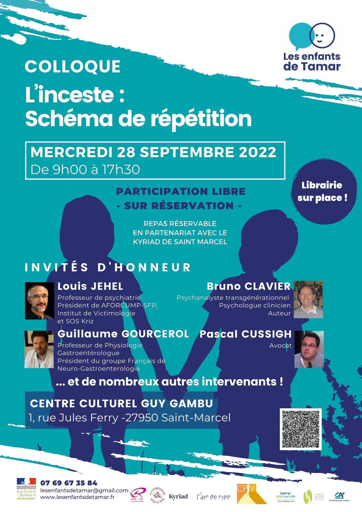 L’association vernonnaise de lutte contre l’inceste, Les Enfants de Tamar, organise son second colloque mercredi 28 septembre de 9h à 17h30 au Centre culturel Guy Gambu (1 rue Jules Ferry, Saint-Marcel). Le thème de cette année s’intitule « L’inceste : schéma de répétition ». De nombreux invités de renom, psychologues, médecins, avocats, s’exprimeront sur le sujet. La 1re édition du colloque avait réuni plus de 170 personnes en 2021.