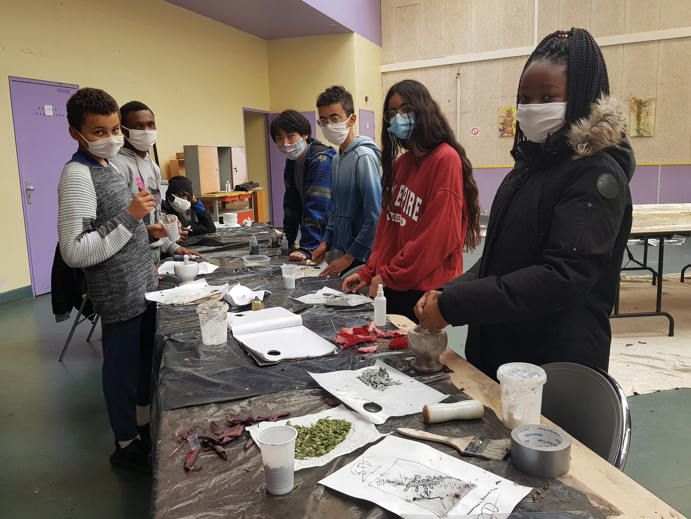 De Monet à Bonnard, la nature vernonnaise n’a de cesse d’inspirer les artistes. Voilà le point de départ de Biodiversité en Seine, un atelier organisé la deuxième semaine des vacances de la Toussaint. Son but : sensibiliser les adolescents des quartiers prioritaires à l’art et au développement durable. Neuf d’entre eux ont répondu présents, orientés par l’Espace Simone Veil. Ils étaient accompagnés par Akira Inumaru, un artiste japonais, diplômé des Beaux-Arts de Tokyo et de Rouen. « Mon travail porte principalement sur la lumière, ce qui m’a amené à la nature et aux plantes », détaille ce plasticien, installé en Normandie depuis 10 ans. « Nous avons donc réalisé une œuvre grâce à des échantillons naturels récoltés en bord de Seine ». La collecte a eu lieu le premier jour, en compagnie d’Yves Helluin, naturaliste de l’association de sensibilisation à l’environnement CARDERE. « Nous avons beaucoup appris », raconte Mourad, 13 ans, « notamment le nom des plantes qui poussent sur les berges, certaines sont très belles comme le coquelicot ». Dans les seaux : de la terre et beaucoup de feuilles mortes.