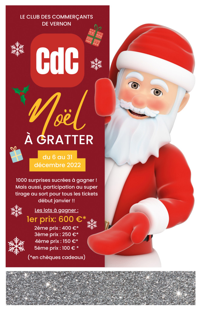 Après les vélos-taxis mis gratuitement à la disposition des Vernonnais tous les weekends de décembre 2022, le marché de Noël de Vernon, voici les tickets à gratter du Club des Commerçants de Vernon ! Du 6 au 31 décembre 2022, 1 000 surprises sucrées sont à gagner avec des tickets à gratter ! Et, dans tous les cas, participation au tirage au sort qui aura lieu début janvier, pour tenter de gagner des chèques cadeaux utilisables dans vos commerces vernonnais participants ! Les lots à gagner :