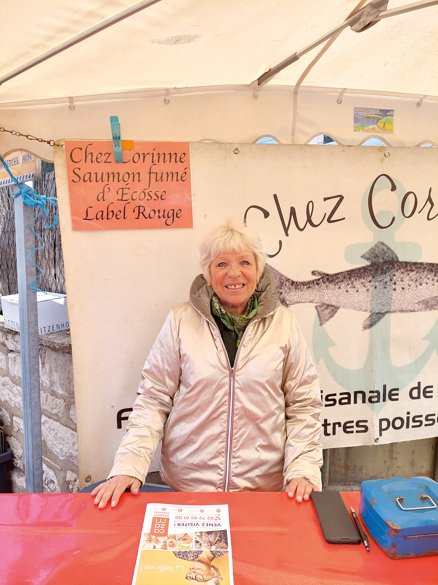 Ancienne poissonnière, Corinne s’est formée au fumage en 2017 à Dieppe. Depuis, elle partage son savoir-faire artisanal sur le marché de Vernon.