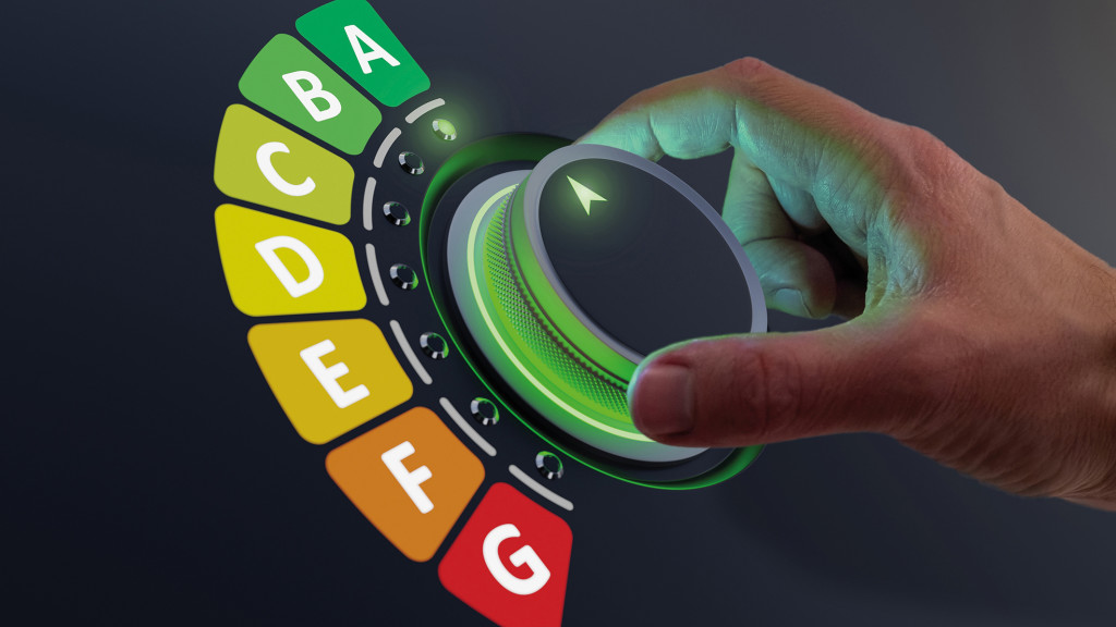 Energy efficiency rating labels promoting low consumption and efficient products to reduce carbon footprint. Lower CO2 emissions with efficient home and appliances. Green eco-friendly business.