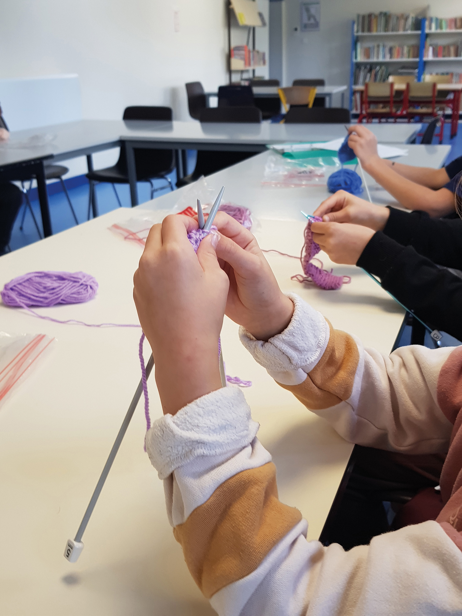 Dans la salle de classe, pas un bavardage. Et pour cause, les sept élèves de CM1 et CM2 sont très concentrés sur le même geste, répété en boucle. Au son des aiguilles, la laine prend forme. « Ca me déstresse », affirme Alice. A côté d’elle, sa camarade Maéline explique : « quand je suis énervée, je fais du tricot et je me sens apaisée, ça me détend. » Les deux écolières se sont volontairement inscrites à cet atelier, proposé chaque vendredi depuis septembre sur la pause méridienne. Pour les initier à cet art ancestral, on trouve deux passionnées de tricot : Sylviane Pottin et Karen Jamois, respectivement présidente et trésorière de Kréa’tout’Eure. « Nous avons créé cette association en 2017 », raconte Karen, « Sylviane est infirmière à la clinique psychiatrique des Portes de l’Eure, elle a remarqué qu’après leur hospitalisation les patients se retrouvaient souvent isolés, c’est comme ça qu’est née l’idée de proposer des ateliers de tricot. » Fabriquer de beaux pulls, certes, mais avec un but : « lutter contre l’exclusion sociale et promouvoir la tolérance ». Depuis, un petit groupe se réunit pour tricoter chaque samedi dans une annexe du centre social des Pénitents. « Le tricot est accessible à tous, il s’agit juste de faire des noeuds, mais c’est très valorisant et on peut s’amuser rapidement. » Les enfants, eux, ont rapidement pris le coup de main et auront terminé des mitaines pour l’hiver. D’ailleurs, le tricot n’a jamais été aussi tendance !
