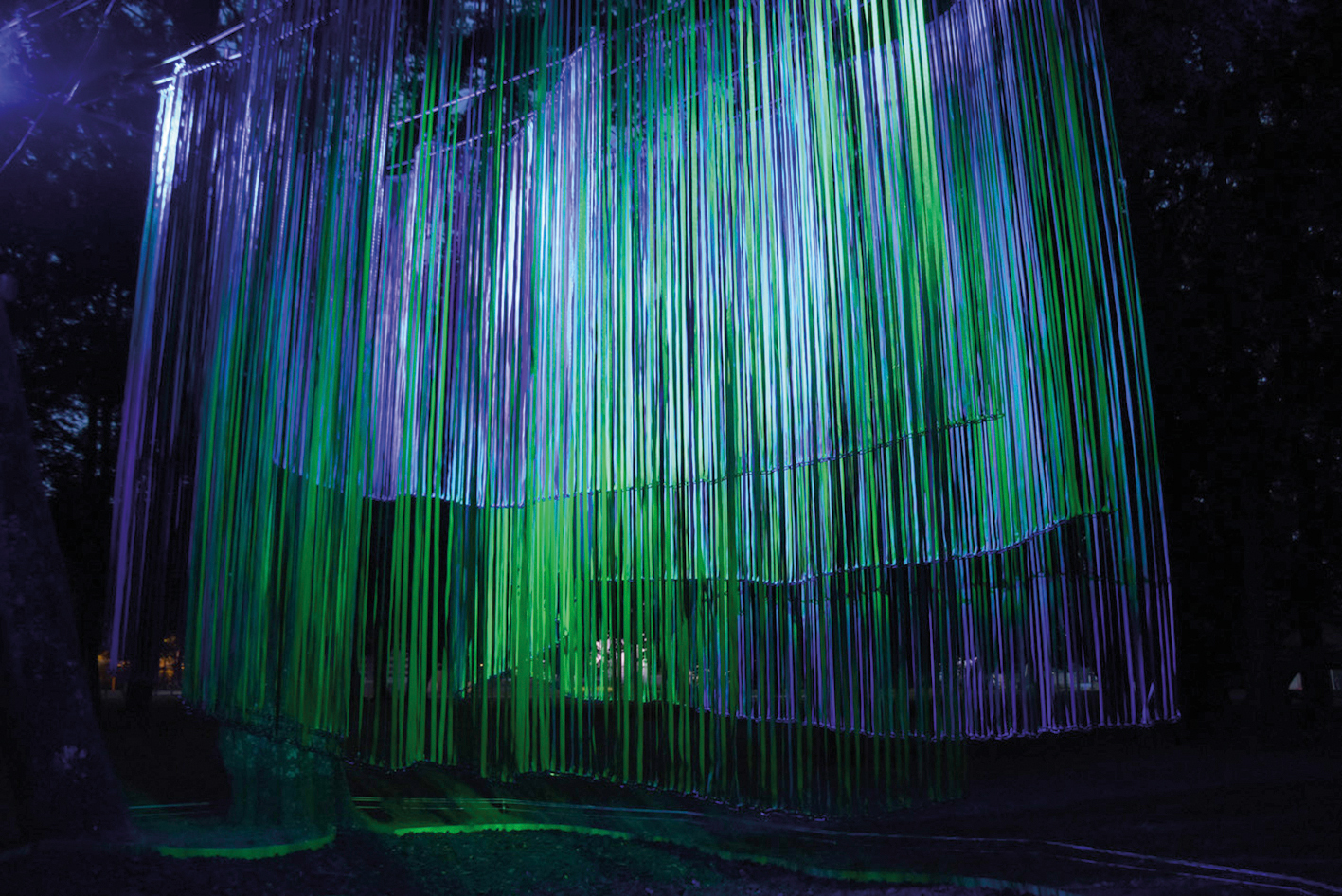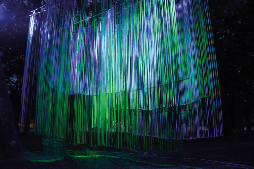 Œuvre in-situ, Le Vent Solaire a spécialement été créé pour le parc des Tourelles et sera démonté le 17 septembre. « J’apprécie particulièrement ce genre d’installations qui permet de discuter avec les passants, c’est un art ouvert à tous et pour lequel il faut jouer avec les contraintes extérieures. » L’œuvre est l’une des trois étapes du parcours Courant d’Art 2023 qui, CVA oblige, nous plonge la tête dans les étoiles avec Thomas Pesquet de l’ISS, le long de la Seine, et Sandrine Elberg au Musée. Illuminé de 20h à minuit, Le Vent Solaire se pare de mille couleurs à l’image des aurores polaires. L’œuvre nous rappelle ainsi la richesse chromatique de la nature. Un peu comme le faisait Claude Monet en son temps, à quelques kilomètres de là.