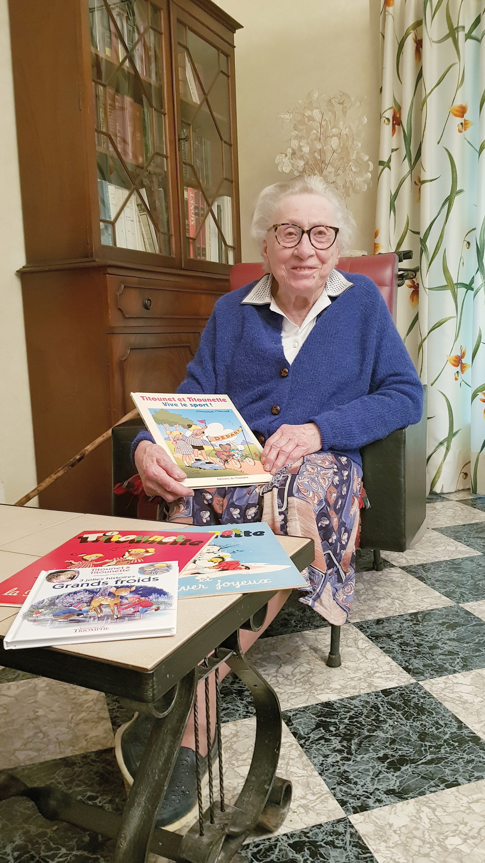 Je suis contente d’être arrivée jusque-là, je crois que j’ai un bon ange gardien ! Et puis j’ai eu beaucoup de visites et de lettres. J’ai beau être célibataire, grâce à mes bandes-dessinées, j’ai des milliers de petits-enfants ! J’ai créé Titounet & Titounette en 1955 pour les revues Cœurs Vaillants puis Perlin et Pinpin. De nombreuses personnes ont connu mes dessins dans les années 60 et 70 et, maintenant âgées, elles m’écrivent. En 1982, j’ai pris ma retraite. Aujourd’hui, je ne peux plus dessiner et cela me manque énormément…