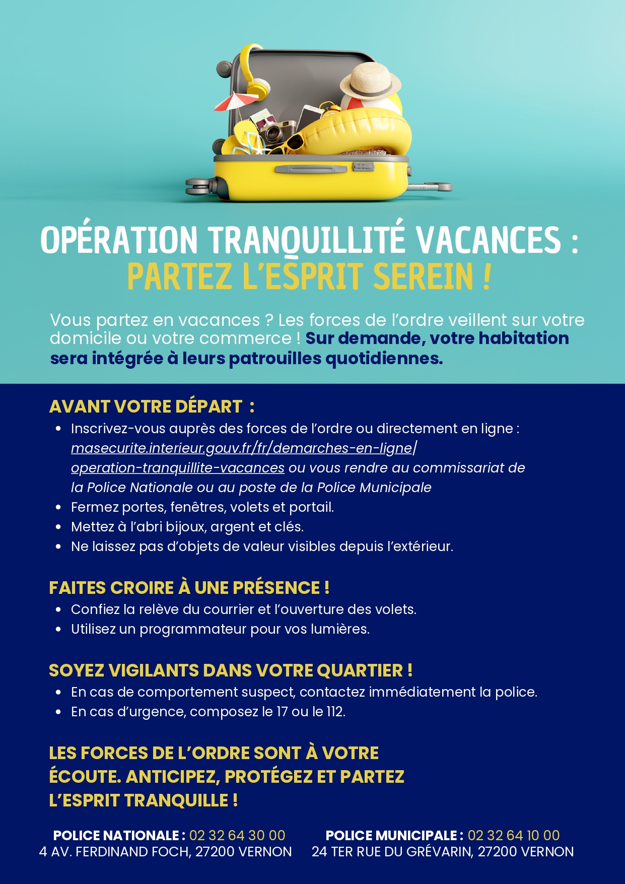 L’opération « Tranquillité Vacances » permet aux habitants de partir sereinement cet été. Chapeauté par le commissariat, ce dispositif prévient les forces de l’ordre de votre absence. Ainsi, les polices nationale et municipale veilleront particulièrement sur votre domicile.