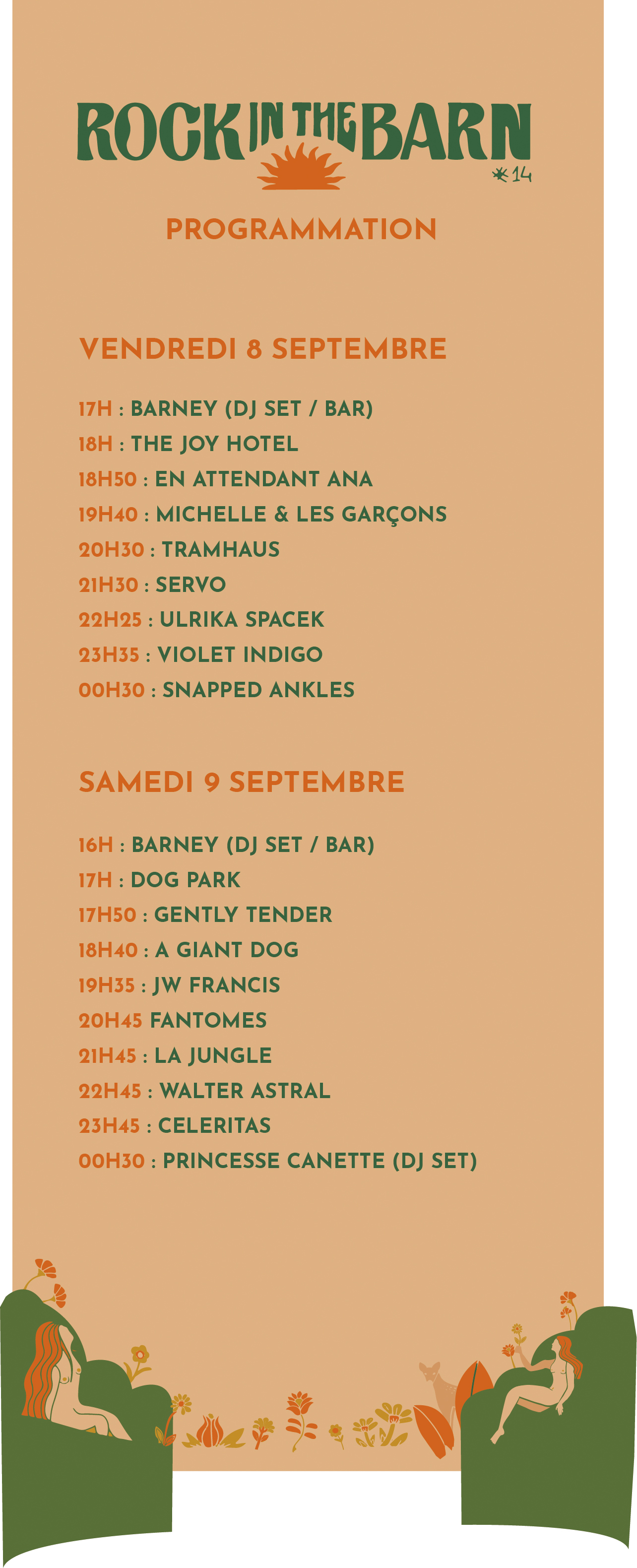 Si la grange (barn en anglais) a disparu au profit du château, quoi de neuf pour cette 14e édition ? « La recette qui fait notre succès reste la même », explique Léna Guerard, la programmatrice, « nous mélangeons des groupes internationaux émergents à des pépites de la scène française. » Dans la première catégorie on trouvera les Britanniques de Snapped Ankles, et leur post-punk barré, ou le glam-rock d’A Giant Dog, débarqué tout droit d’Austin. « Côté hexagonal, citons Michelle & Les Garçons, qui fait partie de cette nouvelle scène pop frenchy aux références 80’s. » Associé au rock garage, indé et psyché, RITB a néanmoins ouvert ses horizons depuis belle lurette. On y entendra donc aussi bien la folk américaine de JW Francis, que le hip hop de la Rouennaise Violet Indigo ou l’électro mystique de Walter Astral. De quoi nourrir ses oreilles de nombreuses découvertes. Et pour l’estomac, Rock in the Barn mise toujours sur de la nourriture et des boissons locales et bio !