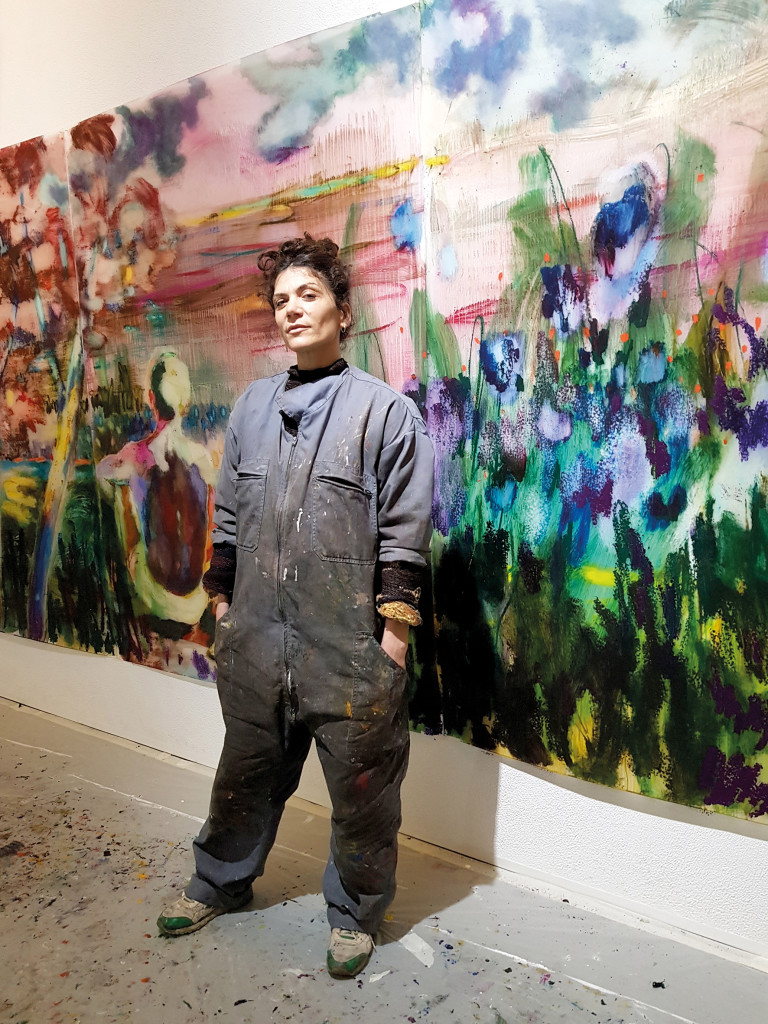 J’ai à cœur de dialoguer avec l’espace et la nature. Le concept de corps-paysage est au centre de mon travail, je joue sur la lumière qui brûle les corps et les renvoie parfois aux frontières de l’abstraction. Avant de peindre, je me suis beaucoup promenée dans les alentours et j’ai pris des photos car j’aime explorer la notion de « cliché » dans ses multiples sens.