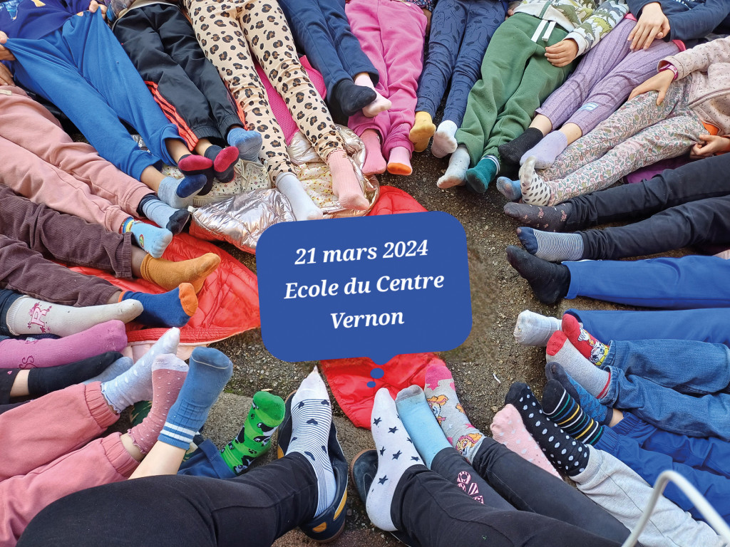 Organisée chaque 21 mars par les Nations Unies, la journée mondiale de la trisomie 21 a pour but de sensibiliser l’opinion à ce handicap. Pour ce faire, le public est invité à porter des chaussettes dépareillées en signe de solidarité. A Vernon, les élèves de l’école du centre ont joué le jeu et se sont même pris en photo. Bravo à eux ! Rappelons qu’une permanence enfance handicap se tient tous les mercredis matins, de 9h à midi, sur rendez-vous à l’hôtel de ville. Plus d’informations : 02 32 64 38 16 / 06 72 07 17 73 ou sbernard@vernon27.fr