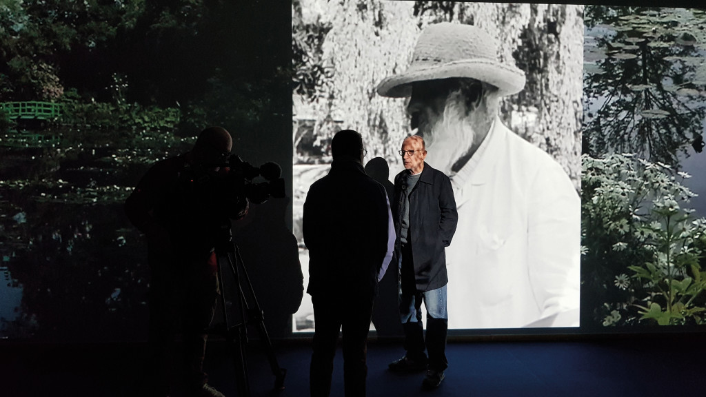 Dès la 1re salle, on découvre « La Mer », œuvre phare d’Ange Leccia. A partir de vagues filmées d’en haut, il tire une œuvre hypnotique et graphique rappelant les estampes d’Hokusai. Sa deuxième vidéo, « Au Film du Temps » a spécialement été créée pour le MDIG et parcourt l’ensemble de la carrière de Leccia à travers un enchaînement de séquences réalisées depuis les années 70. « Il y est question de l’adolescence, un âge de tension que j’aime comparer à l’angoisse de l’artiste habité par sa création », souligne-t-il, « le film essaye d’apporter une réponse à la violence du monde et résonne avec les tensions actuelles. » « (D’)Après Monet », dernière œuvre présentée, est une commande du Musée de l’Orangerie réactualisée. Pour la réaliser, Ange Leccia a eu l’opportunité de filmer le jardin de Monet complètement vide. « Outre l’esthétique, il y a un cheminement philosophique dans ce jardin conçu en pleine 1re Guerre Mondiale. » On y voit un Claude Monet enfermé dans « l’acte chamanique » de peindre dont la seule respiration se trouve dans ce décor végétal. Une immersion totale dans l’œuvre du peintre… comme dans celle d’Ange Leccia.
