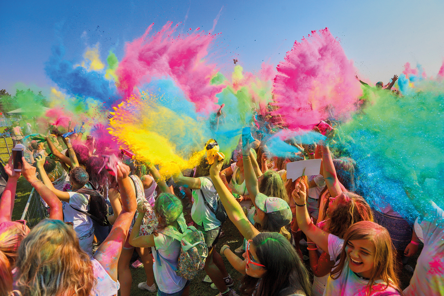 Thessaloniki, Greece – September 2, 2018: Crowds of unidentified people throw colour powder during the « Day of Colours » annual event.