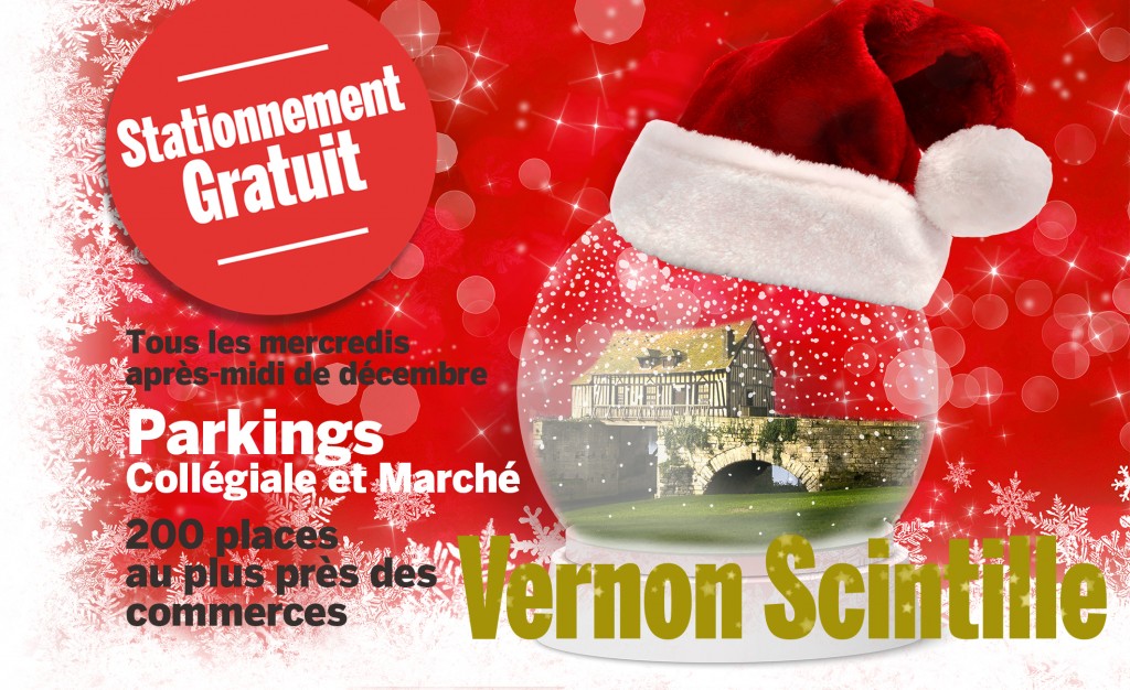 Pour profiter des animations de Vernon Scintille, et faire vos achats de Noël, le stationnement aux parkings Collégiale et Marché est gratuit tous les mercredis de décembre à partir de 12h.
