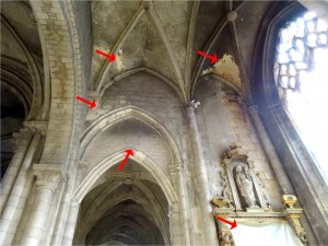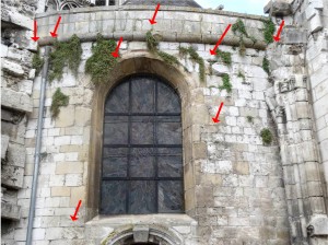 « La collégiale Notre-Dame souffre aujourd’hui de nombreuses pathologies, principalement concentrées à l’extérieur, lesquelles ont des conséquences à l’intérieur, explique l’expert. Outre des problèmes récurrents de vieillissement et d’altération des matériaux, l’édifice subit principalement des défauts d’étanchéité aux intempéries, couplés à des problèmes d’hygiène sanitaire. Ainsi, de manière générale, les couvertures et autres organes d’étanchéité apparaissent vétustes. L’édifice en de nombreux endroits subit des ruissellements importants, illustration des défauts d’évacuation des eaux. Ce problème est d’autant plus flagrant en parement, en raison des développements de micro-végétaux alimentés par une humidité récurrente, lesquels végétaux finissent par encrasser les épidermes jusqu’à solliciter en profondeur les maçonneries par le développement de leur système d’accroche racinaire ».
