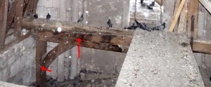Le manque de clôture entre l’extérieur et l’intérieur favorise l’envahissement des combles par des volatiles. Les structures de bois, les planchers et extrados de voûtes sont couverts de fientes, contrariant durement l’hygiène sanitaire interne.