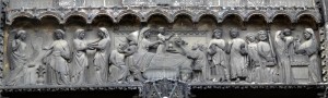 Le saviez-vous ? La façade de la Collégiale, également appelée portail occidental, était autrefois colorée afin de mieux faire encore ressortir les ornements. On trouve ainsi des traces de polychromie sur les parties les moins exposées de l’édifice, comme au pied de la statue de la Vierge à l’enfant qui surplombe l’entrée. La restauration de l’église n’ira pas jusqu’à lui restituer ses couleurs d’origine, mais on pourrait imaginer en donner un aperçu, dans le futur, par des jeux de lumière projetée.