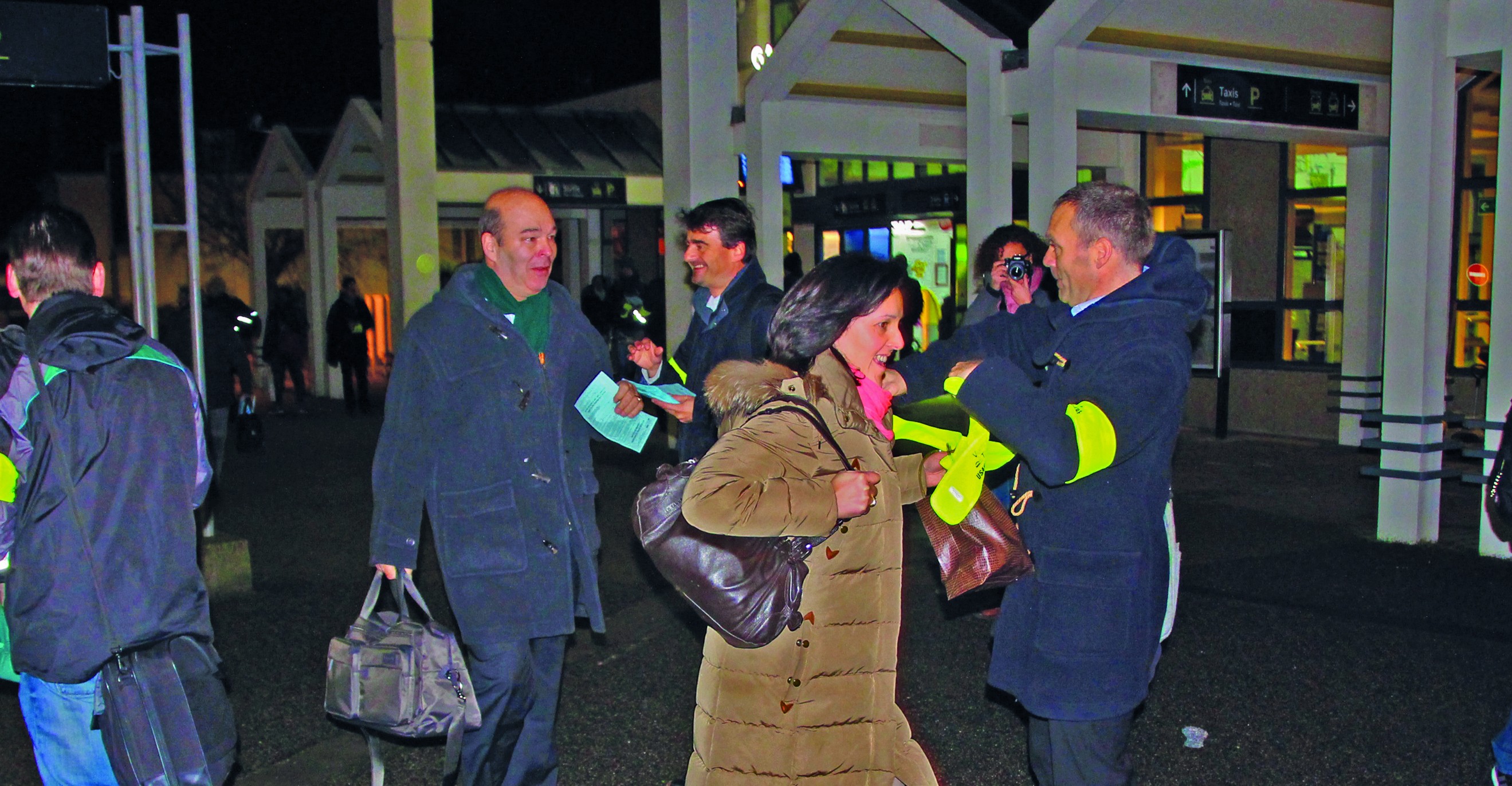 Distribution de brassards à la gare avant le train de 7h39. Le porter, c’est protester !