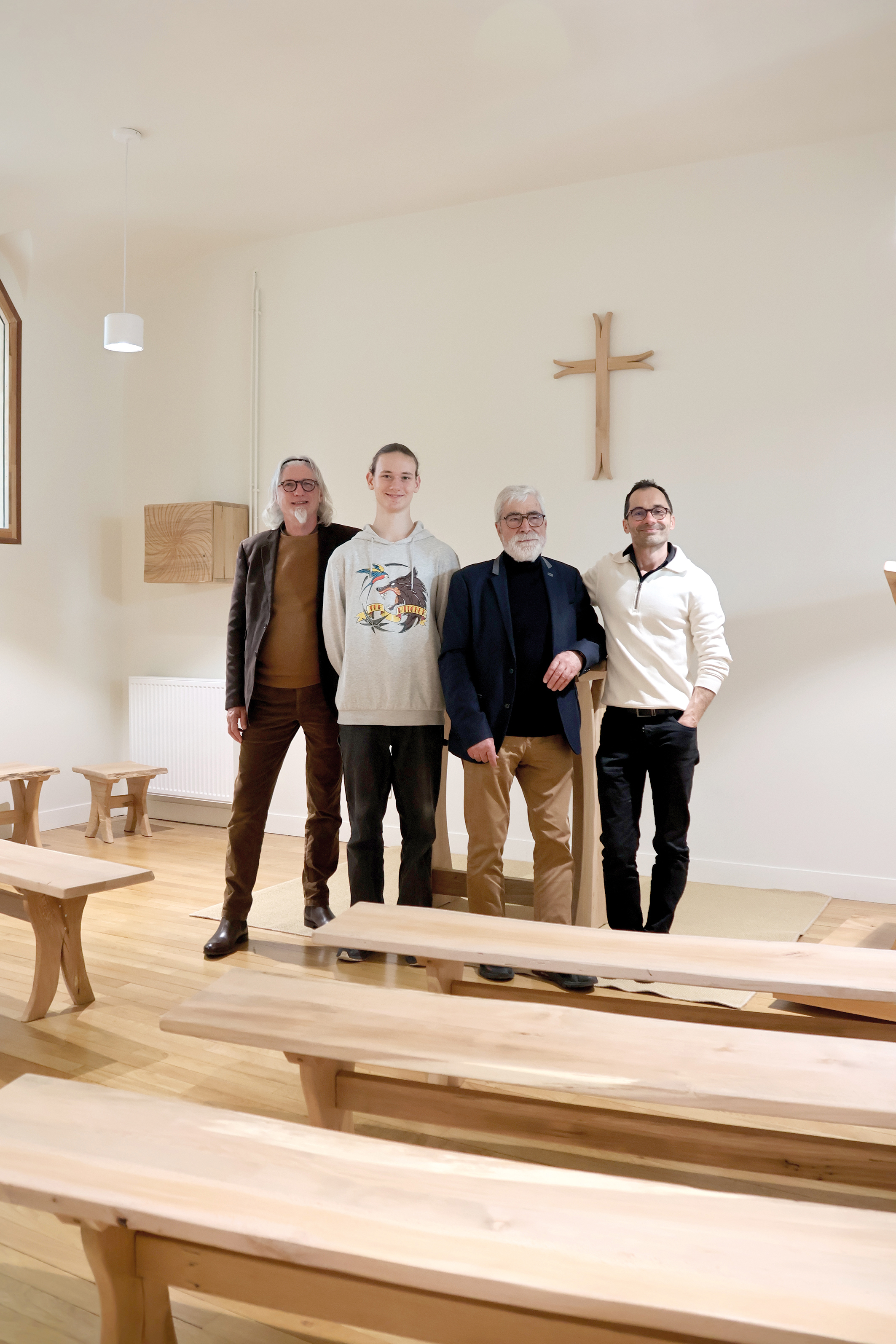 Des murs blancs, du bois clair, des courbes et une ambiance propice à la méditation. Telle est l’atmosphère qui se dégage de la chapelle du Campus Carlo Acutis. « Ce n’est pas anodin de travailler pour un tel lieu », souligne Stéphane Martin-Laprade. Pour le créateur de l’entreprise « La Lampe de Bois », c’était même un défi. En deux mois d’ouvrage, l’artisan a fabriqué un autel, un tabernacle, une console, un ambon et huit bancs. Lors de ce chantier inédit, il était épaulé par Francis Haas, menuisier à la retraite, et par Bastien et Bertrand, ses deux stagiaires. « Au total, j’ai utilisé 3 m3 de bois, du hêtre massif originaire du nord de Rouen », raconte M. Martin-Laprade, « mon but était de produire un mobilier simple, sobre et spirituel, j’ai travaillé les courbes pour qu’elles partent en direction du ciel. » Le résultat a conquis l’équipe du Campus, les différents prêtres et l’évêque d’Evreux, présents lors de la cérémonie de bénédiction. En septembre dernier, Stéphane Martin-Laprade s’était déjà illustré en inaugurant un banc en bord de Seine, créé avec des seniors lors d’ateliers au CCAS de Vernon.