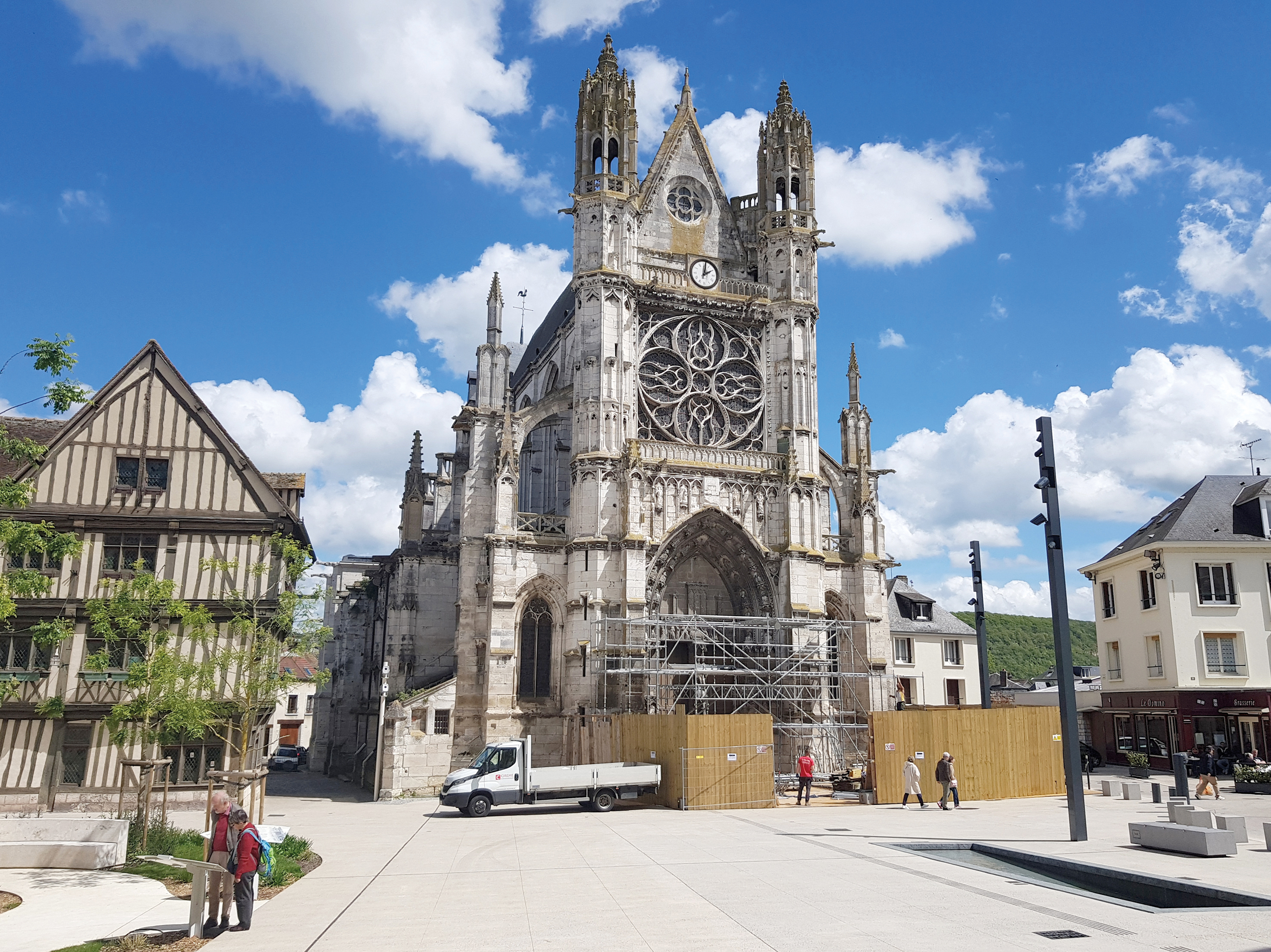 Tailler des pierres à plusieurs dizaines de mètres du sol parmi les saints, les vierges et les gargouilles. La tâche peut sembler gothique. Heureusement, les moyens techniques ont évolué depuis le 14e siècle ! Preuve en est l’immense échafaudage de 500 m² qui orne désormais la façade de la collégiale et dont l’installation s’achèvera fin mai. Jusqu’en juin 2025, il permettra aux artisans d’accéder au portail, à la rosace et au pignon de l’édifice. Ces trois éléments, situés dans la partie centrale de la façade, constituent la première tranche des travaux de cette phase 2. « La priorité est de nettoyer les sculptures des voussures qui furent jadis recouvertes d’un badigeon de plomb », explique Nicole Balmary, maire-adjointe en charge de la culture et du patrimoine, « ce travail de haute précision permettra de révéler d’anciennes traces de pigments car, à l’époque médiévale, les statues étaient peintes. » Cette opération se déroulera jusqu’en juillet et nécessitera la fermeture du portail. Les artisans s’attelleront ensuite au nettoyage de la façade, au remplacement des pierres trop abîmées et à la restauration des sculptures. « Nous respectons au maximum l’identité du monument en utilisant le matériau d’origine, la pierre de Vernon, et en conservant les traces de l’Histoire comme les destructions de la Révolution. » Après un an de travaux, les équipes s’occuperont de la partie nord (gauche) de la façade puis de la partie sud (droite) afin de rénover les bas-côtés et les deux tourelles. L’échafaudage culminera alors à 70 mètres du sol. Comme lors de la phase 1, l’Atelier d’Architecture Richard Duplat, agence spécialisée dans les monuments historiques, est à la manœuvre. Parmi les entreprises sélectionnées, on retrouve notamment TERH, société d’exploitation de la pierre de Vernon.