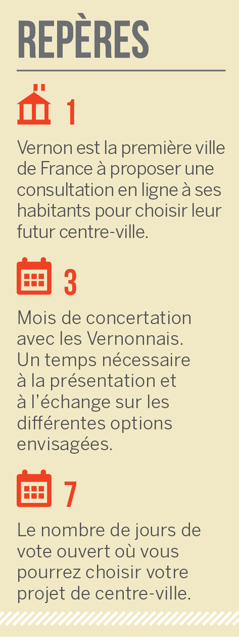 Quel avenir pour le centre-ville de Vernon ? Et bien c’est vous qui déciderez grâce à la grande consultation lancée ce mois-ci par la municipalité ! Au choix : trois propositions que les habitants vont devoir départager. Une démarche inédite en France qui s’inspire des méthodes innovantes de la participation citoyenne.