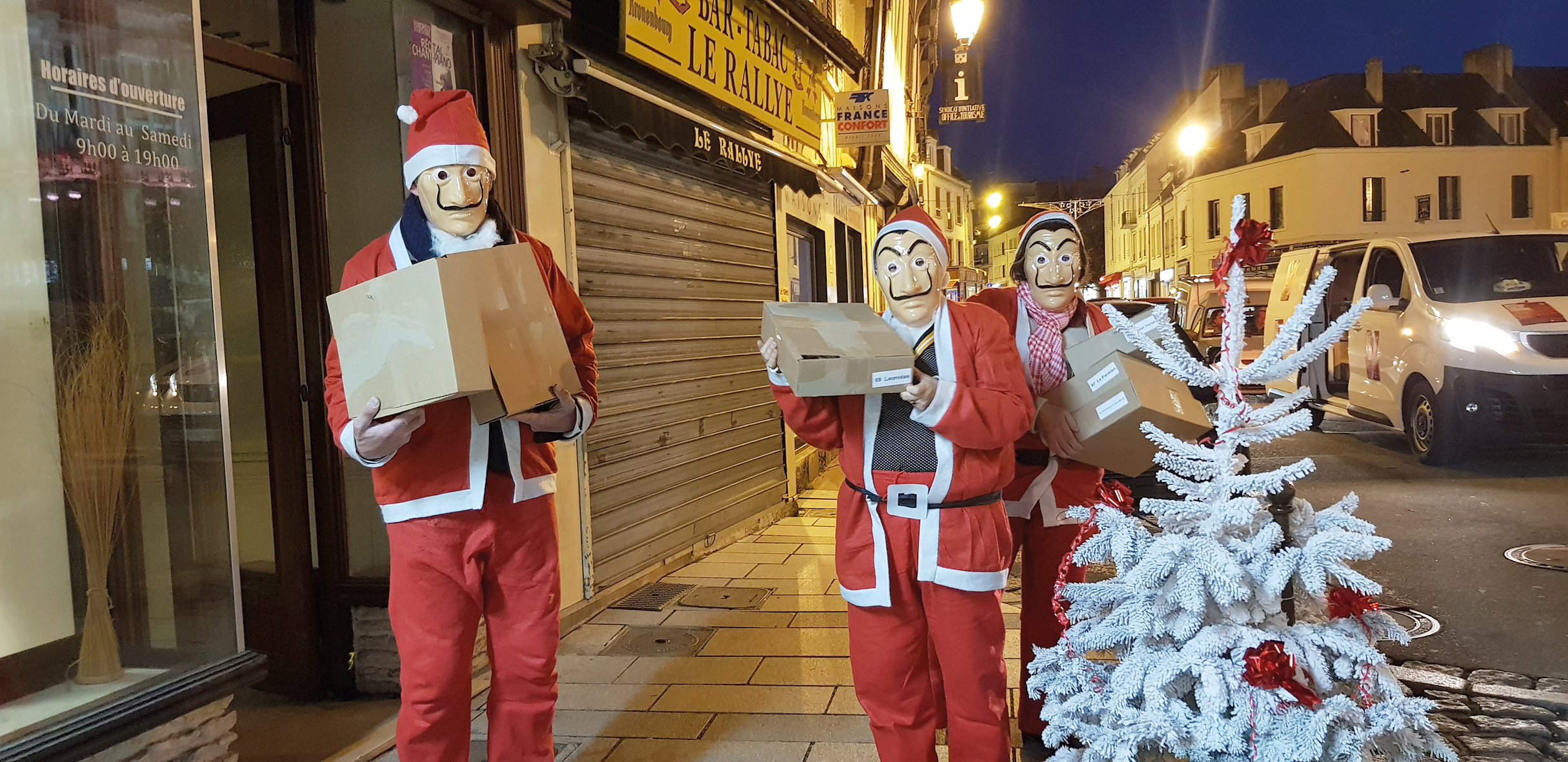 Le Club des Commerçants met son plan à exécution, mais c’est pour la bonne cause. Après avoir pris le contrôle de la page Facebook des Vitrines de Vernon, la mystérieuse organisation a réalisé sa première action en ville le 29 novembre. Plusieurs de ses membres vêtus de tenue de Père Noël et portant le masque de Dali, de la série La Casa de Papel, ont distribué des colis à une centaine de commerçants. A l’intérieur : places de cinéma, sacs en tissu ou bien tickets de stationnement gratuits. Autant de cadeaux qui sont à gagner jusqu’au 27 décembre grâce au jeu à gratter que les clients peuvent récupérer dans ces boutiques. Tous les tickets permettent de participer à une loterie afin de remporter un mois de salaire (dans une limite de 2 000€).