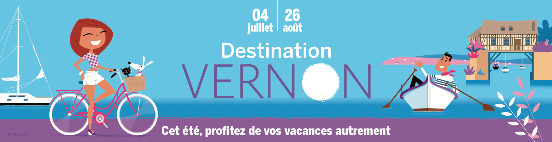 Destination Vernon a pour but de faire de Vernon une station balnéaire. Dans l’esprit, bien-sûr, quoique la Seine occupe une place majeure au sein de l’événement ! Il s’agit de deux mois d’activités proposées gratuitement par la ville : initiations sportives, cinéma en plein air, ateliers