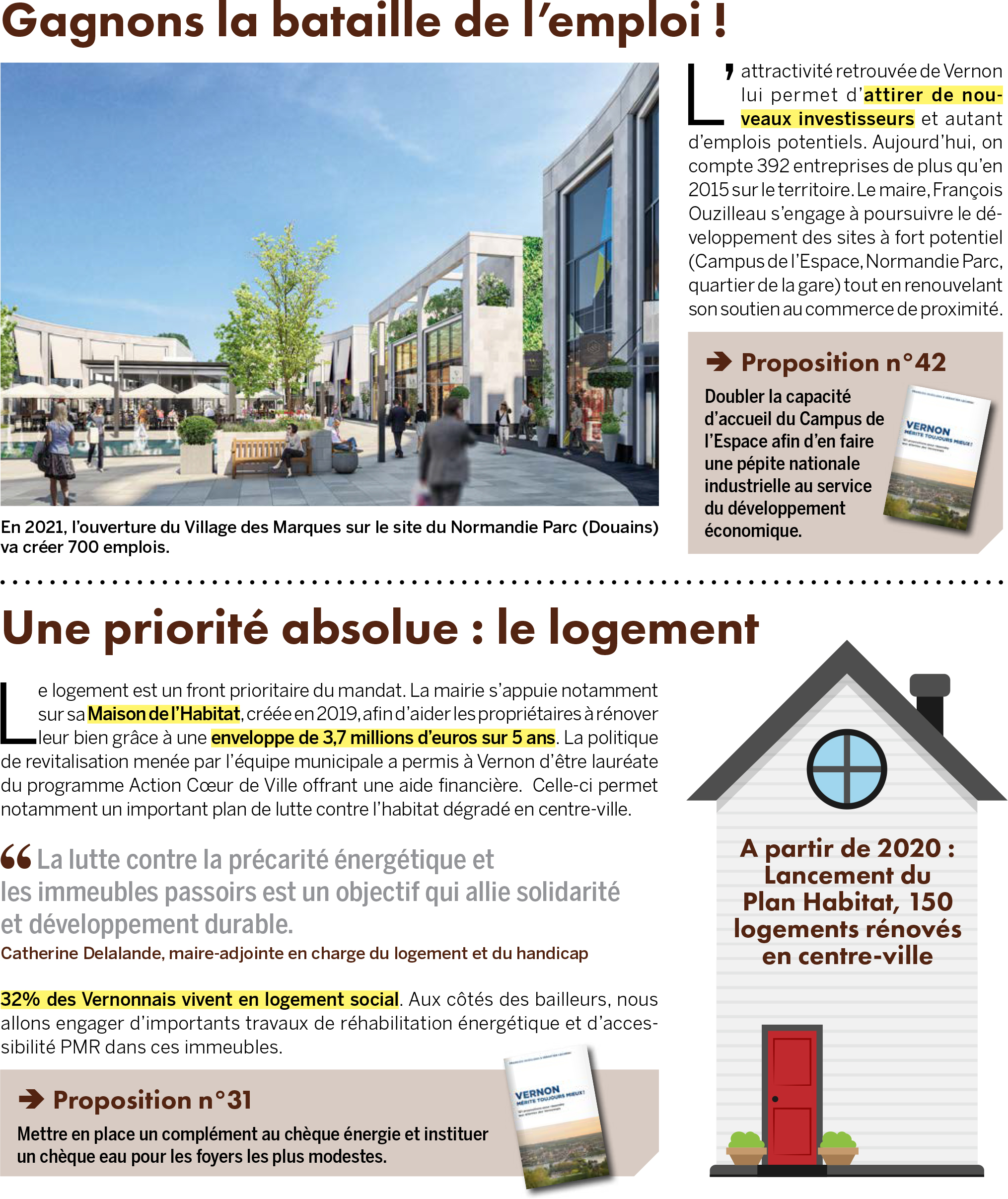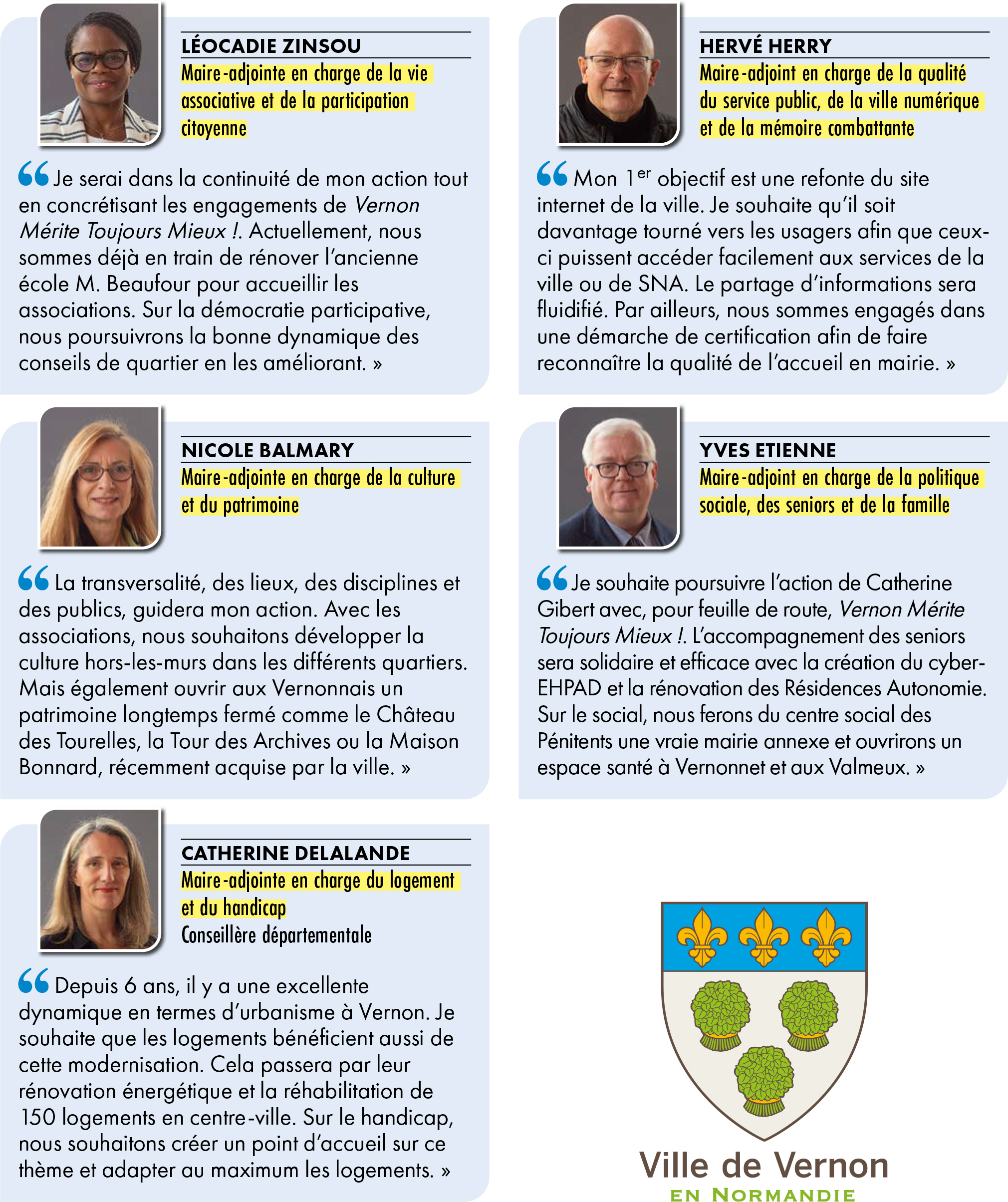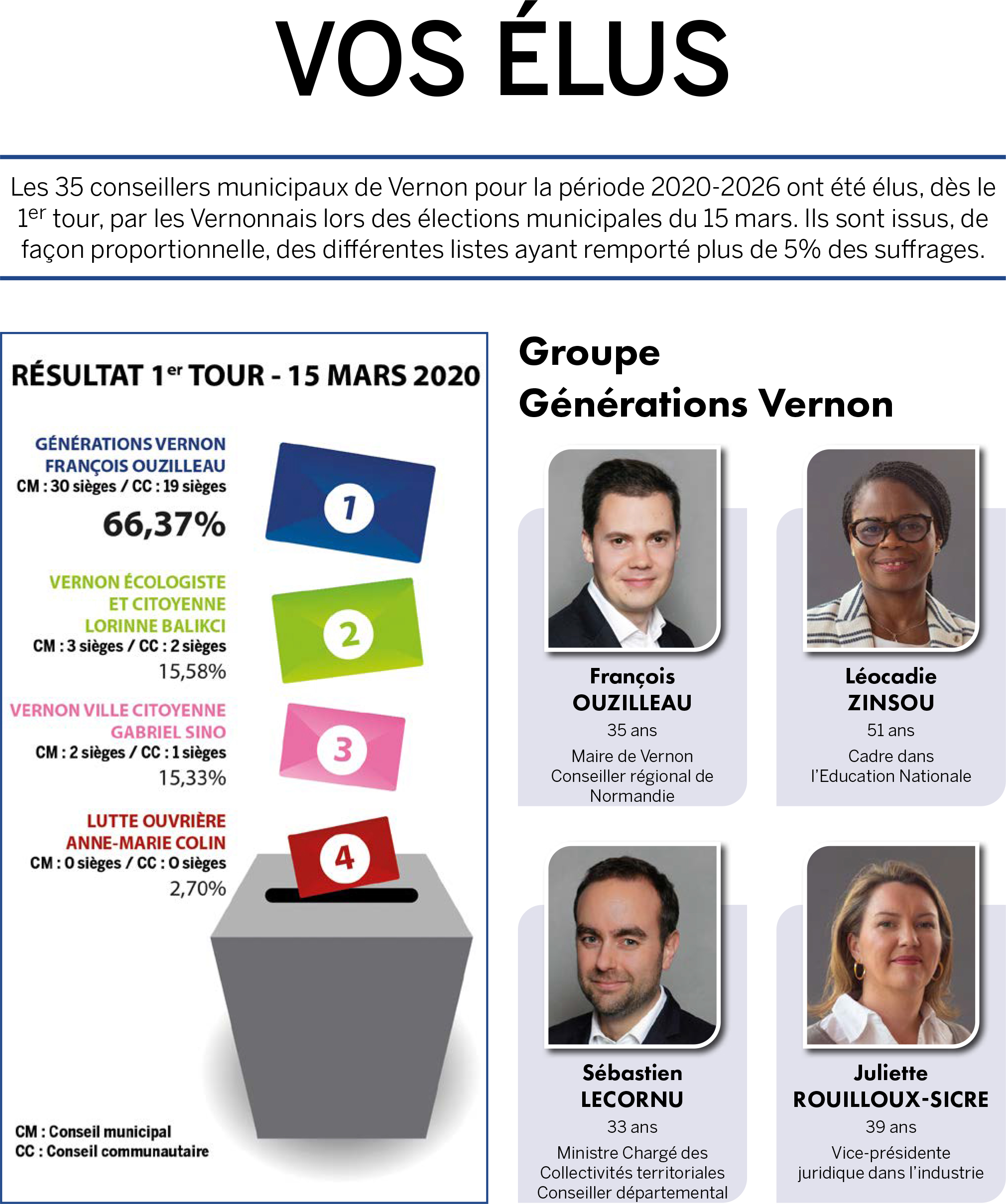 Les conseillers ont ensuite procédé à l’élection des 10 maires-adjoints. La liste Générations Vernon, seule en lice, a remporté le scrutin à l’unanimité des suffrages exprimés. Vous découvrirez ces nouveaux adjoints aux pages 24 et 25 de ce numéro. « Désormais, nous avancerons le plus vite possible afin de réaliser les 121 propositions de Vernon Mérite Toujours Mieux ! », s’est engagé François Ouzilleau. Un projet pour Vernon à découvrir dans le détail tout au long des pages suivantes de ce magazine.