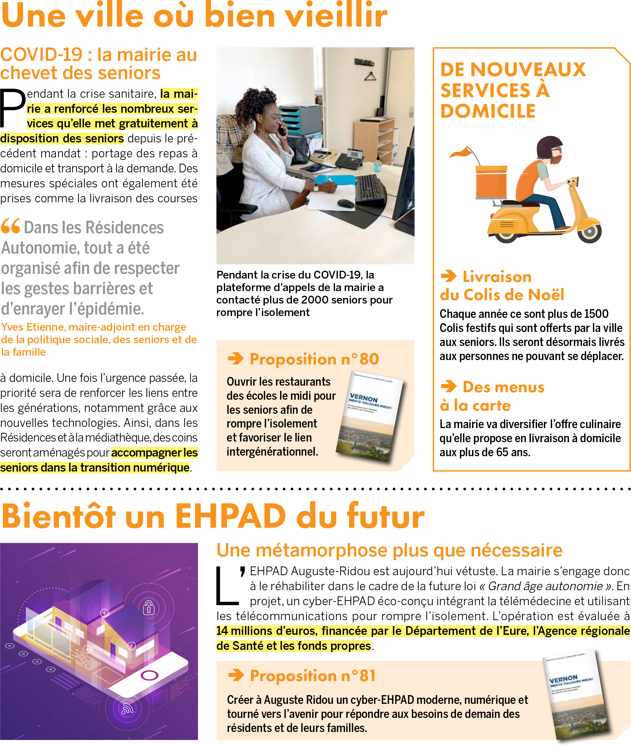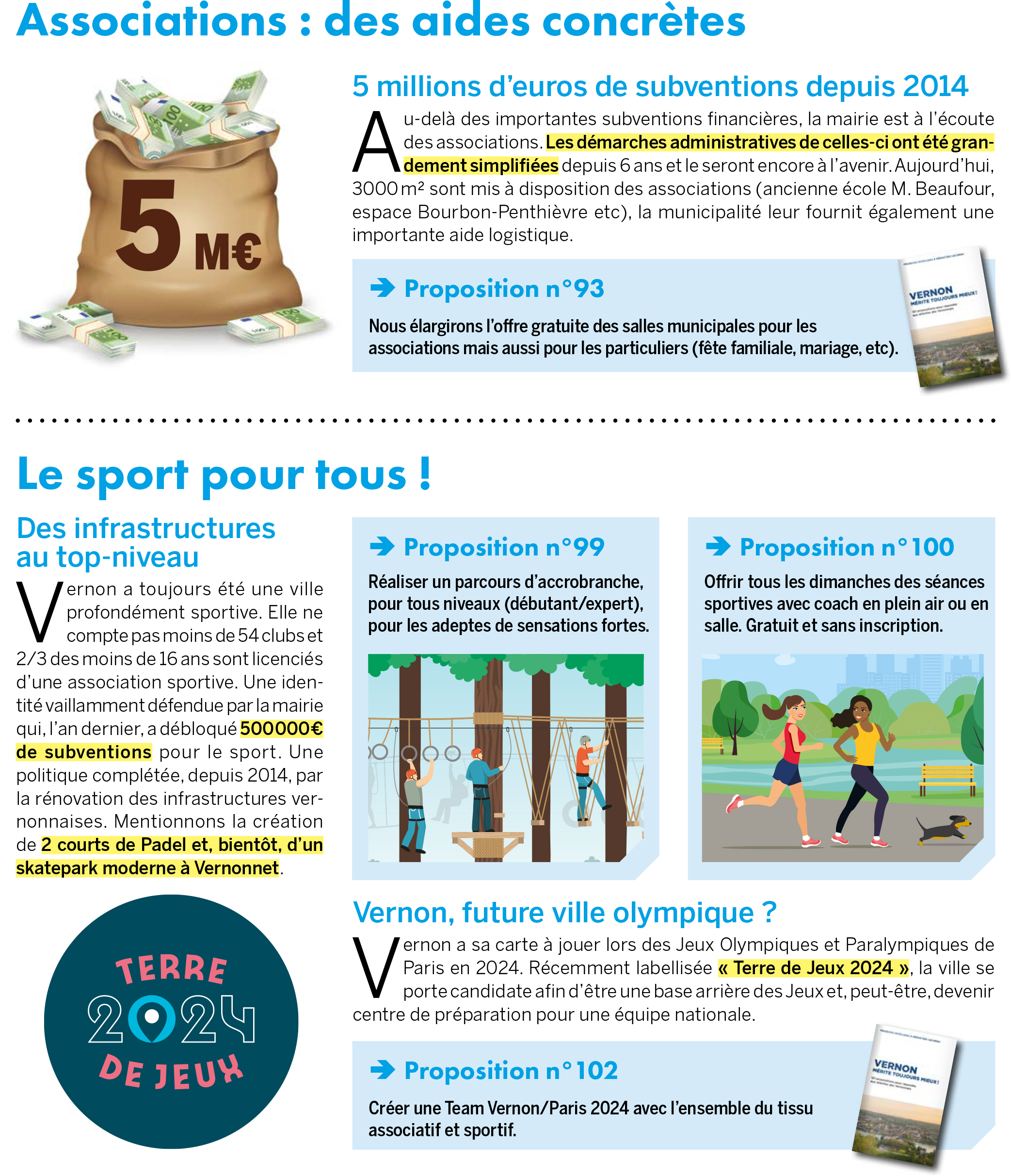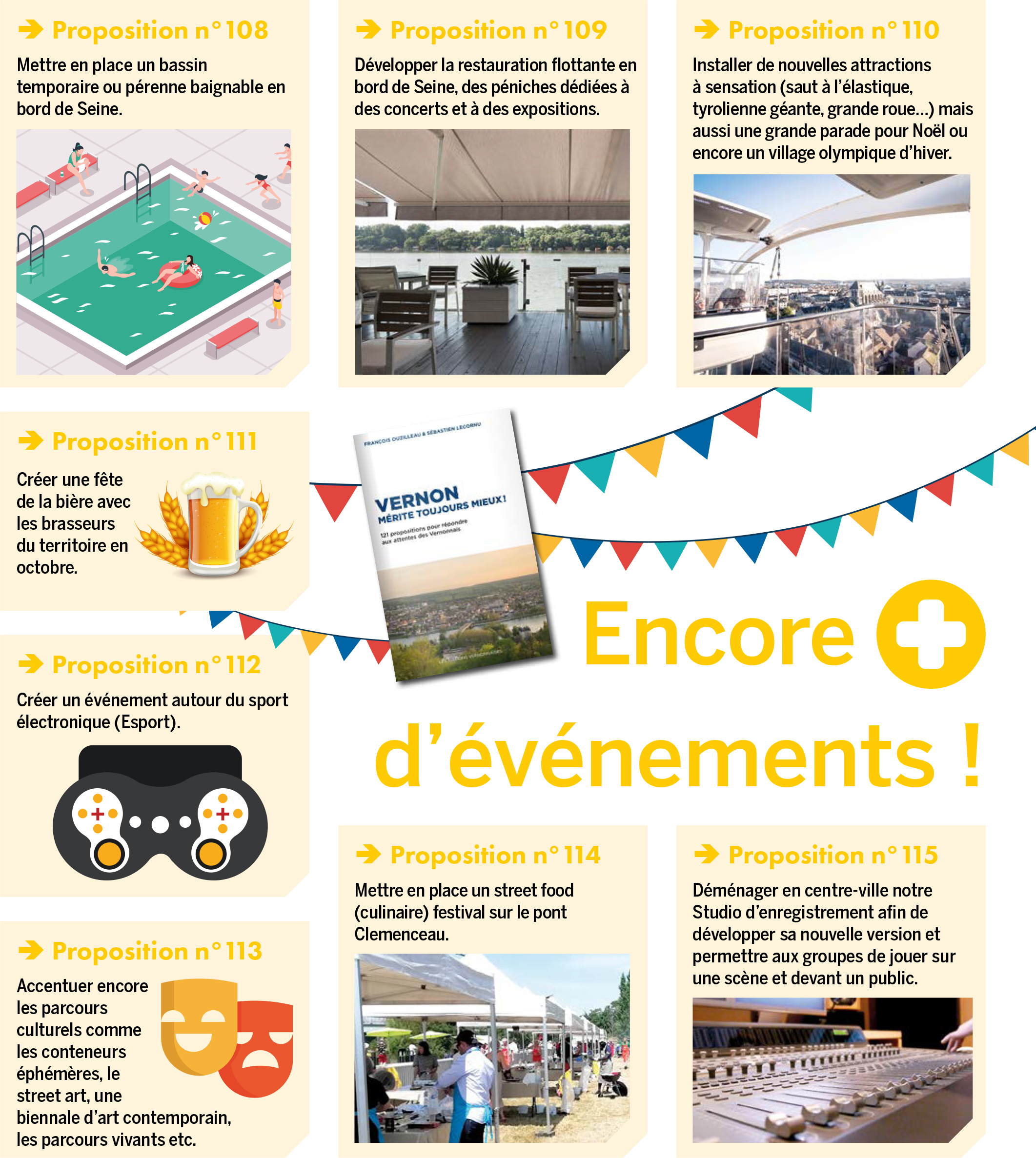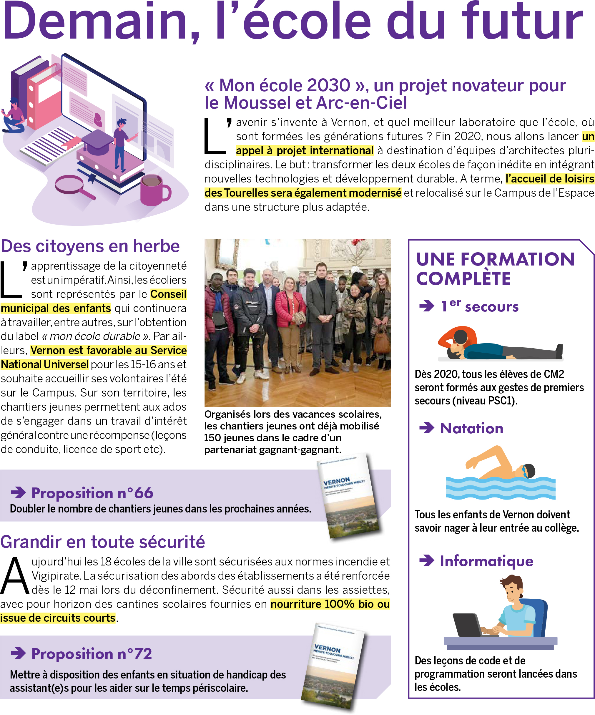 Les conseillers ont ensuite procédé à l’élection des 10 maires-adjoints. La liste Générations Vernon, seule en lice, a remporté le scrutin à l’unanimité des suffrages exprimés. Vous découvrirez ces nouveaux adjoints aux pages 24 et 25 de ce numéro. « Désormais, nous avancerons le plus vite possible afin de réaliser les 121 propositions de Vernon Mérite Toujours Mieux ! », s’est engagé François Ouzilleau. Un projet pour Vernon à découvrir dans le détail tout au long des pages suivantes de ce magazine.