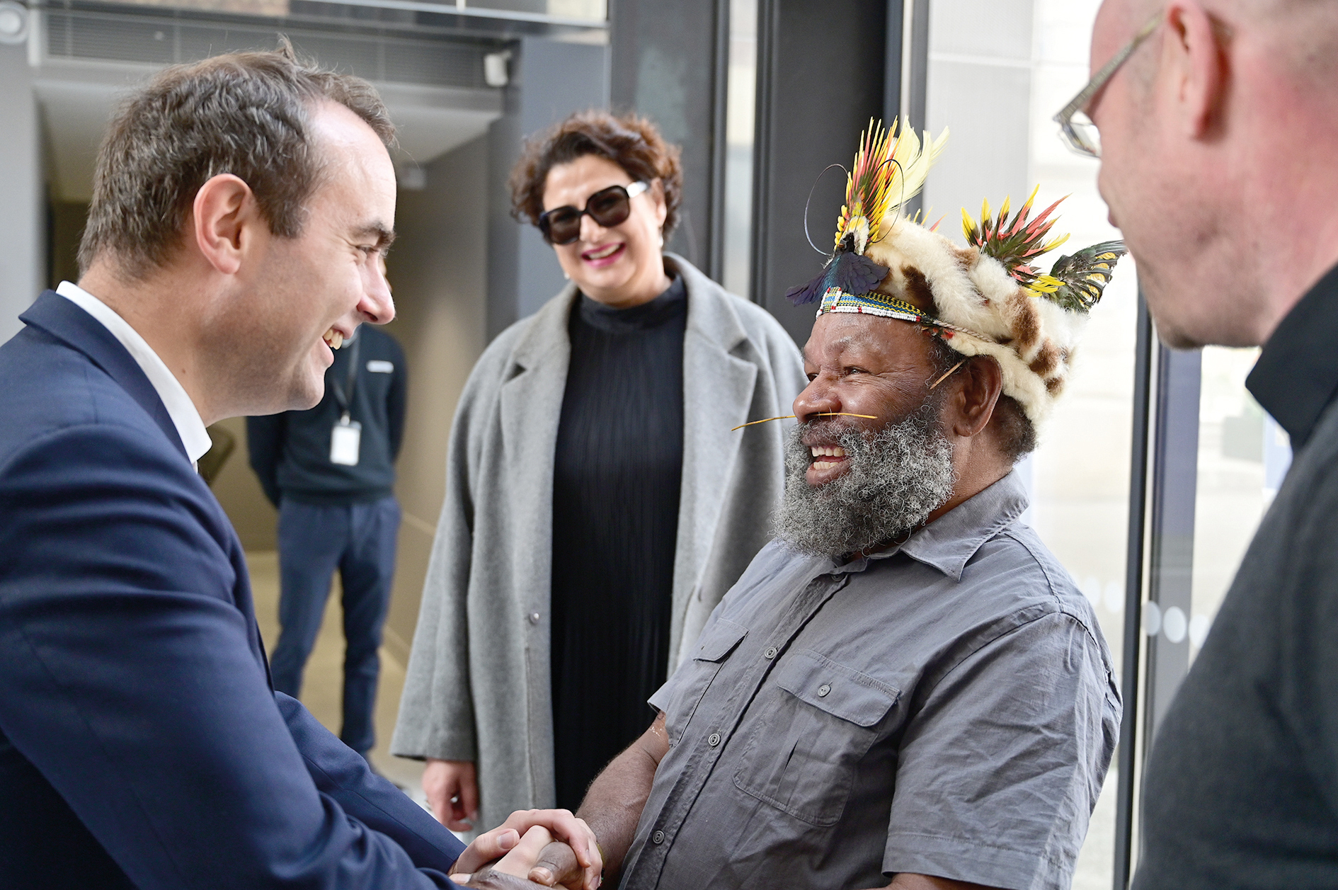 « Le temps de regarder ce film, plus de 150 grands arbres seront tombés dans mon pays », c’est le triste constat dressé par Mundiya Kepanga lors de la projection de « Frères des Arbres » au théâtre d’Evreux, le 29 avril. Invité pour l’ouverture du festival Les Anthroposcènes, ce dignitaire du peuple Huli parcourt le monde afin d’évoquer les ravages de la déforestation dans son pays, la Papouasie-Nouvelle-Guinée. « Frères des Arbres », réalisé par Marc Dozier, lui est consacré. Dans la salle, 44 collégiens se sont entretenus avec M. Kepanga. Le président du Département, Sébastien Lecornu, est allé à sa rencontre, soulignant l’importance « pour l’Occident consumériste de voir ce qu’il se passe là où les populations sont victimes du réchauffement climatique. »