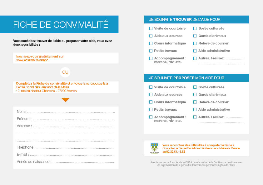 Le Centre Communal d’Action Sociale et les Centres Sociaux de la ville de Vernon mettent à votre disposition une fiche de convivialité, avec le réseau Ensembl’, pour vous permettre de trouver facilement de l’aide ou proposer la vôtre auprès de vos voisins seniors.