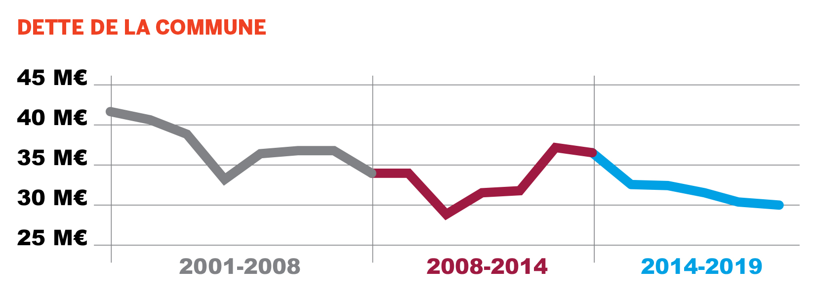 7 M€ de dettes en moins à la charge des Vernonnais depuis 2014, c’est l’engagement de Vernon Mérite Mieux n° 120. En effet, celle-ci est passée de plus de 36,5 M€ en 2014 (soit 1453 €/habitants alors que la moyenne nationale était de 941 €) à environ 30 M€ en 2019, plaçant Vernon en-dessous de la moyenne d’endettement des villes similaires.
