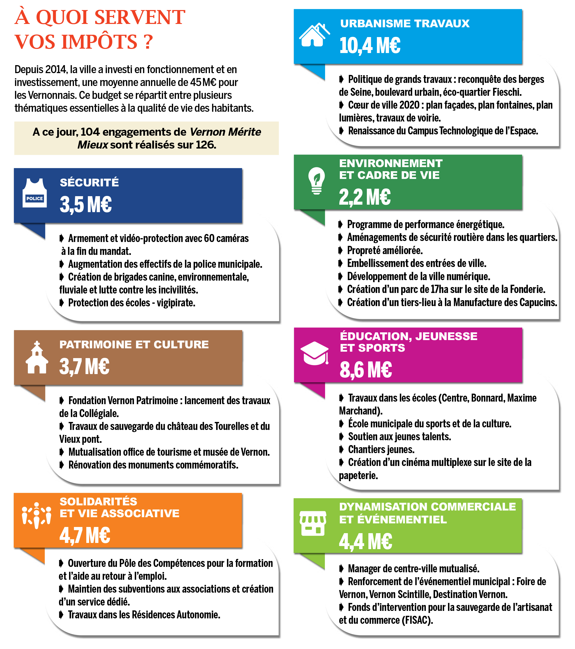 « En poursuivant nos efforts entamés dès 2014 et grâce à l’attractivité retrouvée de Vernon, nous pourrions envisager une baisse des impôts dans les années à venir » Sébastien Lecornu et François Ouzilleau.