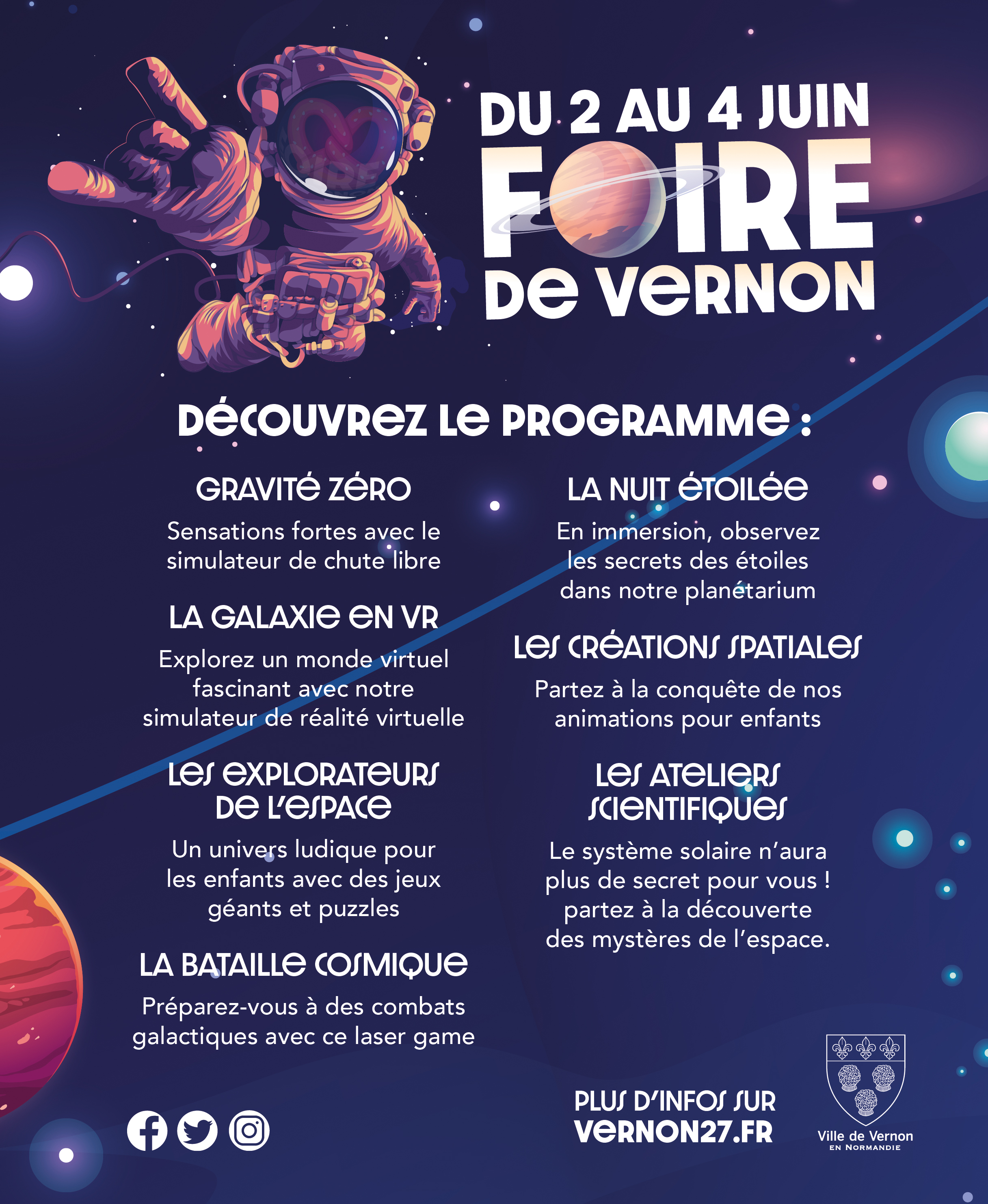 Tant attendue, elle est enfin de retour les 2, 3 et 4 juin ! Et cette année avec un thème des plus galactiques ! François Ouzilleau, maire de Vernon nous invite à venir vivre des moments uniques et à explorer de nouveaux horizons dans une ambiance festive et pleine de découvertes.
