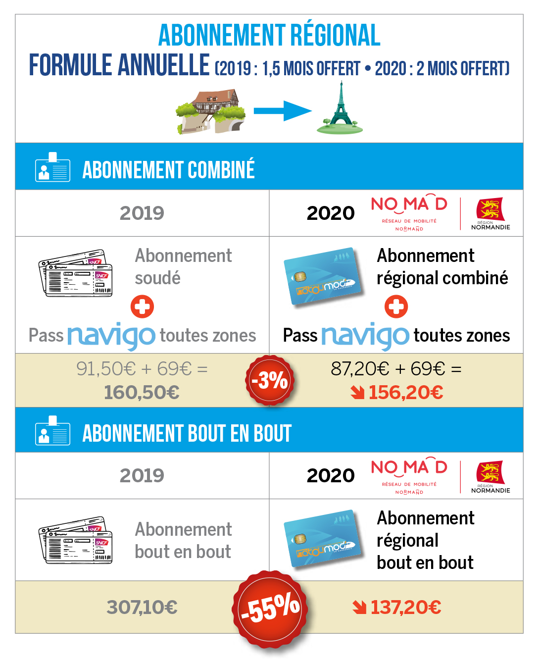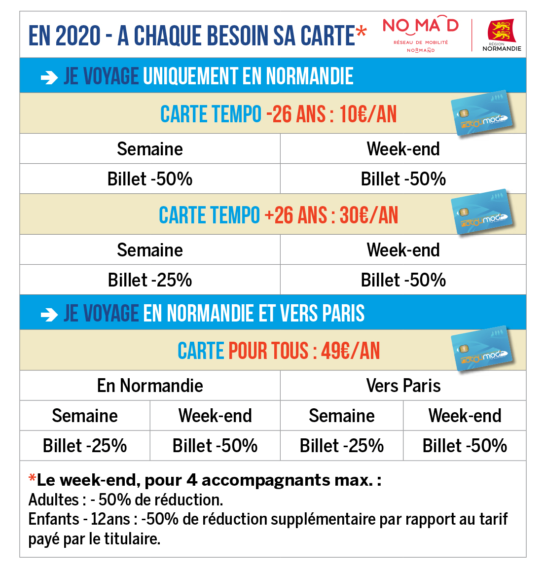Autre innovation permise par Nomad : la mise en place de nouvelles cartes de réduction, y compris vers Paris. Concernant les trajets sur les lignes normandes uniquement, la carte Tempo est élargie aux adultes de plus de 26 ans. Celle-ci leur permet d’obtenir, pour 30€ par an, une réduction de 25% sur le prix des billets la semaine, et de 50% le week-end. Un rabais qui dépasse les frontières régionales puisqu’un autre forfait, à 49€ par an, permettra quant à lui d’obtenir une réduction similaire sur les trajets normands et ceux en direction de Paris. L’autre bonne nouvelle, c’est qu’ils permettront à 4 accompagnants de profiter de ces réductions le week-end. Une volonté d’encourager la mobilité de tous à l’heure où le train reste le moyen de transport le plus respectueux de l’environnement.