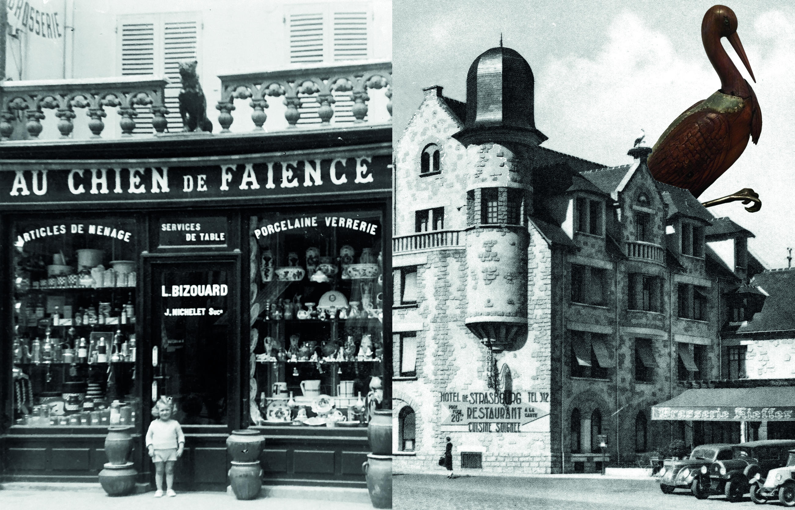 Posté entre les deux rambardes d’un petit balcon, il se tenait en sentinelle au-dessus d’un magasin proposant des services de vaisselle et bibelots fragiles. Le chien reste fidèle à son poste jusqu’à ce sinistre matin de braderie d’août 2002 où un inconnu parvient à le kidnapper. Comment l’homme a-t-il pu s’y prendre sans se voir infliger une terrible morsure de porcelaine au mollet ? Les crocs du dogue devaient être passablement usés. Dans quel chenil a-t-il trouvé asile ? Dans quelle cour de brocanteur prend-il la poussière ? Sur quelle pelouse s’agace-t-il des pitreries de nains de jardin ? Certaines nuits, les riverains de la rue d’Albuféra assurent entendre des grognements et des aboiements étouffés. Ainsi donc, le fantôme du canidé veillerait toujours sur le quartier. Durant des années, un second animal a protégé le secteur de ses larges ailes. C’est en 1932 que des émigrés alsaciens font construire le Strasbourg, un hôtel-brasserie situé en face à l’hôtel d’Évreux. Une cigogne en bois et son nid ornent majestueusement l’un des sommets de ce haut lieu des soirées Vernonnaises jusqu’à la triste démolition de février 1994. Depuis ce jour, l’oiseau aux serres d’acier se morfond dans les réserves du musée de Vernon. Une question demeure : où sont passés ses oeufs ? Dans quelle cave ont-ils été remisés ? À la manière de ceux d’un dinosaure, ils espèrent sans doute éclore un jour à la faveur d’un improbable rayon de soleil. Les cris que pousseraient ces cigogneaux survolant le toit du musée ne manqueraient pas de sortir de sa torpeur une mère qui les attend en équilibre sur une patte depuis plus de vingt ans.