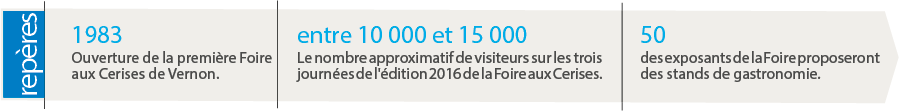 Créée il y a maintenant 34 ans, la Foire aux Cerises fait partie du patrimoine communal. Cette manifestation est organisée par le Comité de la Foire aux Cerises, avec le concours parfois d’autres partenaires, comme le Comité de Jumelage ou bien encore Les vitrines de Vernon.