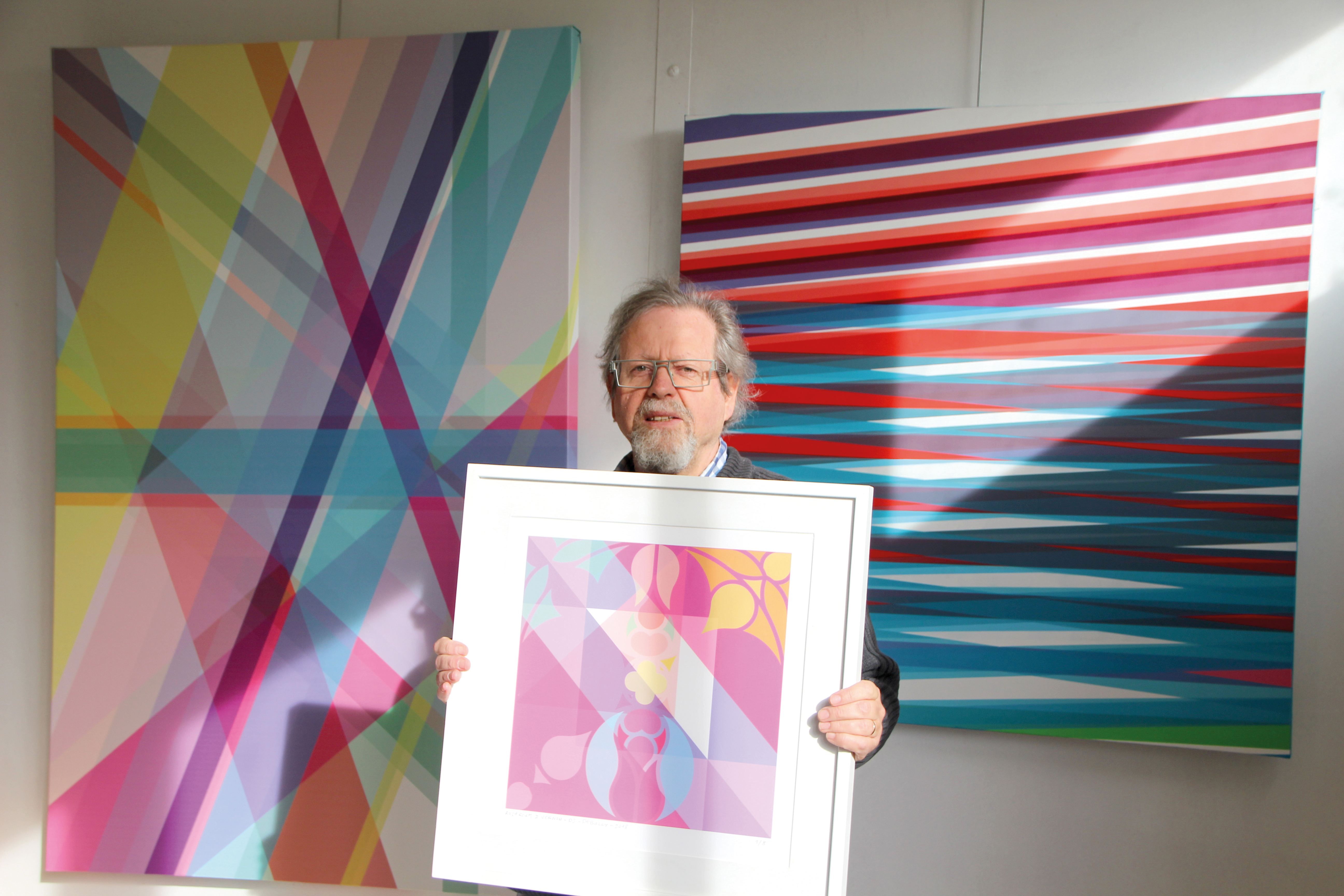 Auparavant j’ai fait de la peinture figurative sous mon vrai nom, Michel Cribelier. Mais je pense que l’art est une aventure, qu’il faut toujours innover. Ainsi, dans les années 80, je me suis intéressé à la décomposition de la lumière. J’ai alors découvert une loi naturelle : seules 4 couleurs permettent de recréer la lumière : le jaune, le rouge vermillon, les bleus cobalt et outremer. Cette théorie est difficile à appliquer en peinture figurative, j’ai donc décidé de le faire dans l’abstraction géométrique. J’ai alors créé un logiciel qui me permet de jouer avec la transparence, les couleurs etc. Je repeins ensuite le résultat mais je propose aussi des œuvres uniques imprimées en sérigraphie.