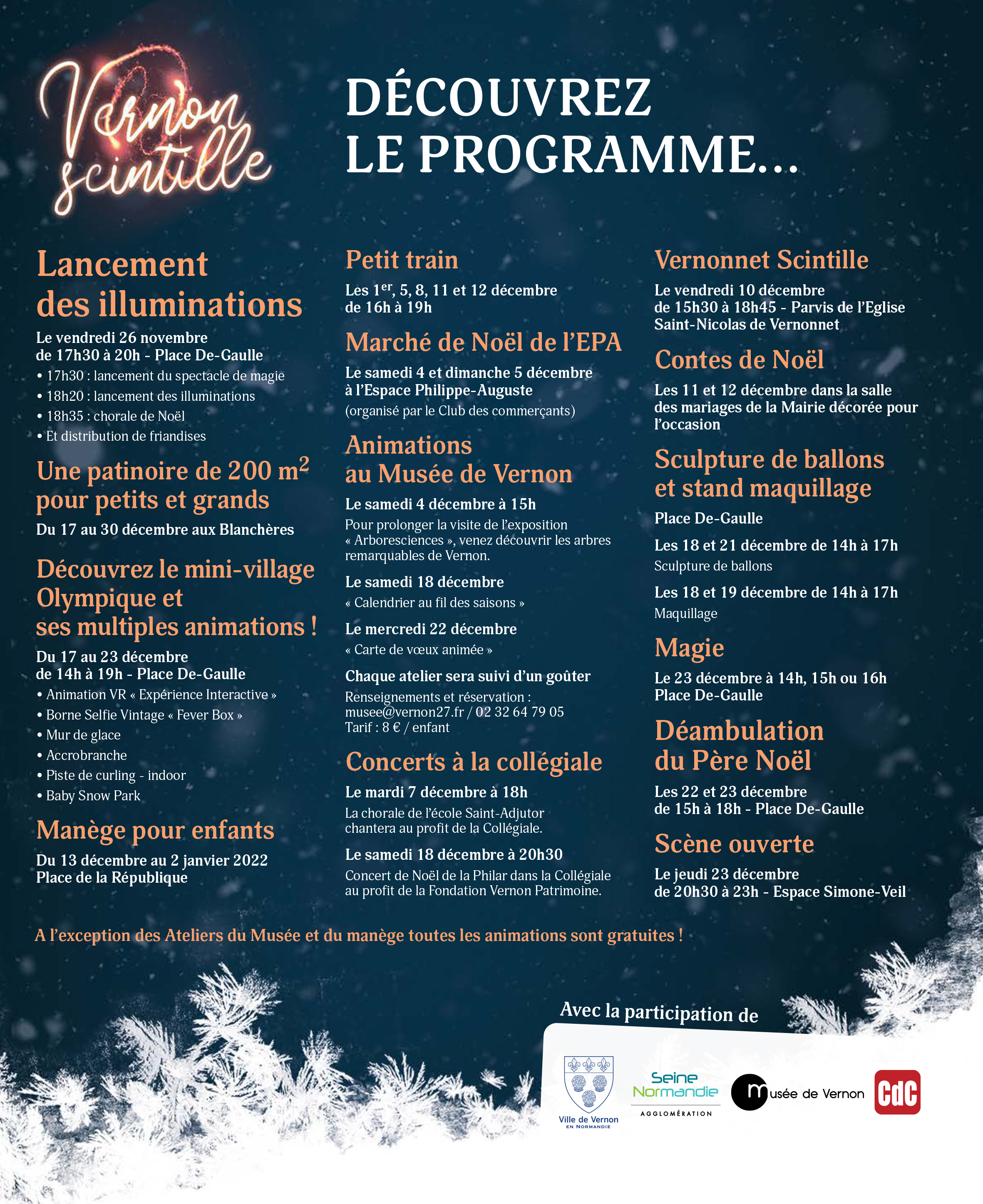 Vernon Scintille revient avec son programme d’animations gratuites. Dans la hotte du Père Noël : de nombreuses nouveautés. Entre illuminations majestueuses, patinoire et sports d’hiver, grimpez vite dans le traineau affrété par la municipalité !