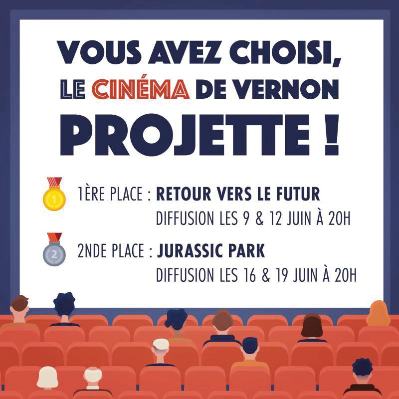 Près de 300 personnes ont voté sur le compte Facebook de la ville afin de choisir un film qu’elles souhaitaient voir projeté au mois de juin. Et le match était très serré entre Les Goonies, Jurassic Park et Retour vers le Futur. Vu l’engouement suscité par le scrutin, premier du genre à Vernon, il a été décidé que deux films passeraient au cinéma. La semaine dernière, deux séances de Retour vers le Futur ont eu lieu. Et pour (re)voir Jurassic Park, rendez-vous les 16 et 19 juin à 20h !