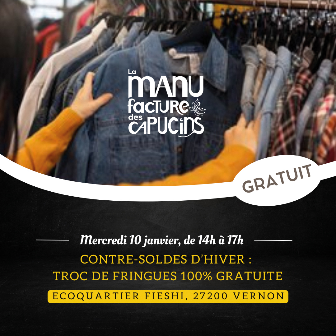 Vivez l’expérience unique des Contre-Soldes d’Hiver ! Joignez-vous à notre troc de vêtements 100% gratuit, le mercredi 10 janvier de 14h à 17h à la Manufacture des Capucins. Explorez un nouveau monde de la mode, échangez vos trésors vestimentaires et adoptez un style éco-responsable. Rejoignez-nous pour une journée de partage et de créativité. Ensemble, redéfinissons la mode d’une manière durable et accessible ! Poussez la grille de chantier, c’est ouvert !