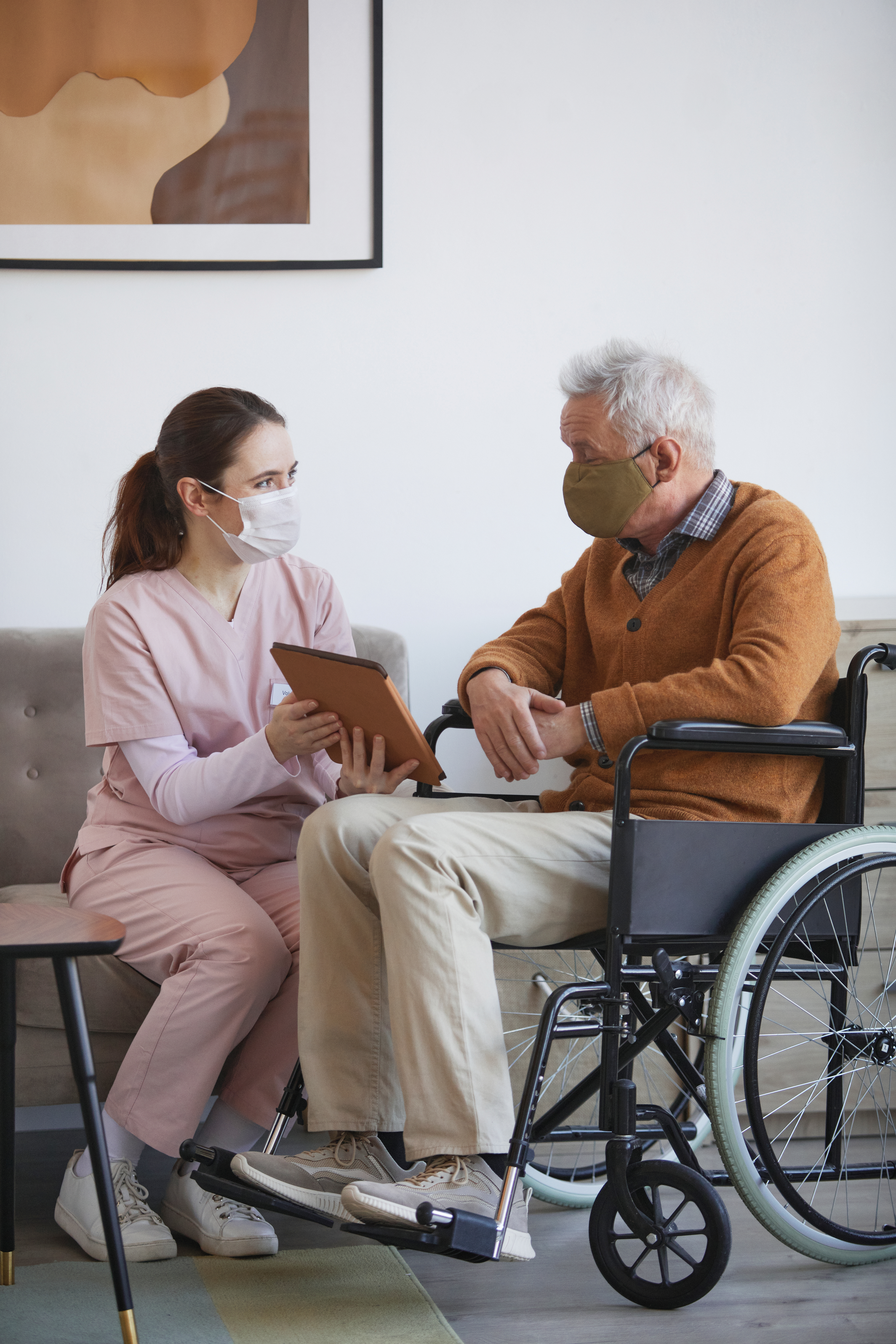 Vertical full length portrait of young female nurse assisting senior man in wheelchair using digital tablet at retirement home, both wearing masks