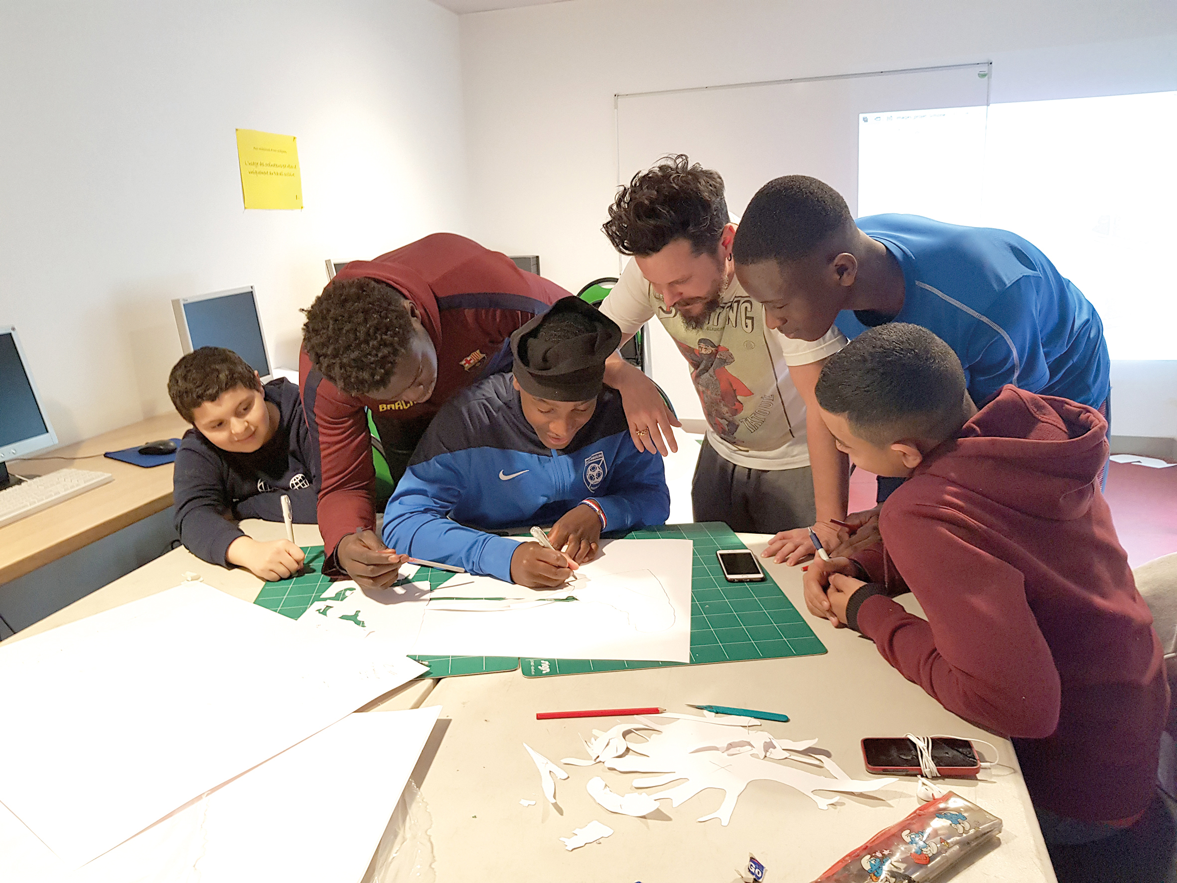 Assis autour d’une table à l’Espace Simone-Veil, Stanislas Mbemba, 15 ans, est concentré. Avec ses quatre camarades, il fabrique des pochoirs. « Avec un scalpel je découpe dans une feuille les formes qu’on voit à l’écran », décrit le collégien. Le fruit de ce travail méticuleux servira ensuite à embellir les locaux à poubelles des immeubles du cours de la Futaie. D’ailleurs, un autre groupe de 6 jeunes est parti mettre un coup de blanc sur les murs afin de préparer la réalisation des fresques. Tous les 11 participent à ce chantier jeunes organisé par les centres sociaux des Pénitents et Simone-Veil du 8 au 12 avril, soit la première semaine des vacances de Pâques. « C’est mieux que de rester à la maison », résume Plamedi Boladja, 14 ans, « on travaille avec ses amis et puis on apprend des choses ». Mais ce qui les motive, c’est également la récompense car, en retour, les adolescents partent trois jours au Parc Astérix.