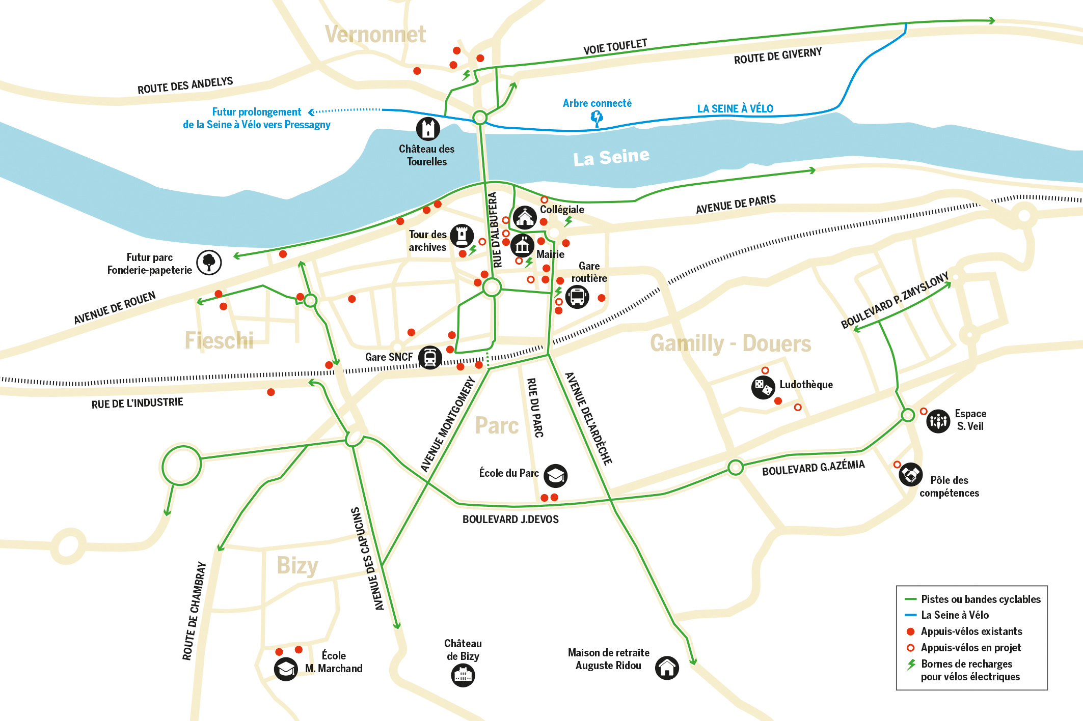 La plus grande avancée en termes de mobilités douces est la possibilité de suivre le cours de la Seine des deux côtés. Sur sa rive gauche, l’aménagement des berges par la mairie intègre une piste cyclable permettant désormais de relier le site du halage à celui de la fonderie-papeterie. Une requalification qui continue et qui, sous peu, s’attaquera à l’amont des berges.. Selon le maire François Ouzilleau, « cet aménagement restitue la continuité des berges et inscrit Vernon dans l’axe Seine tout en faisant cohabiter les différents usagers, piétons comme cycles ».