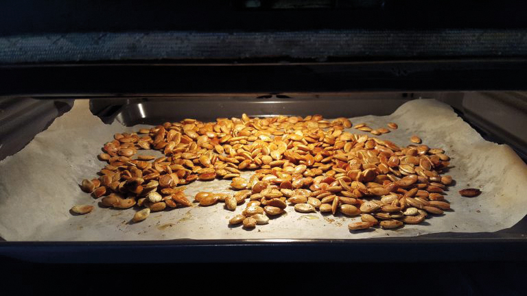 Enlever les filaments et reste de chair de votre courge puis les laver et bien les sécher dans un torchon propre. Etalez les graines sur la plaque et laisser cuire 20 min (elles doivent foncer mais pas brûler !).