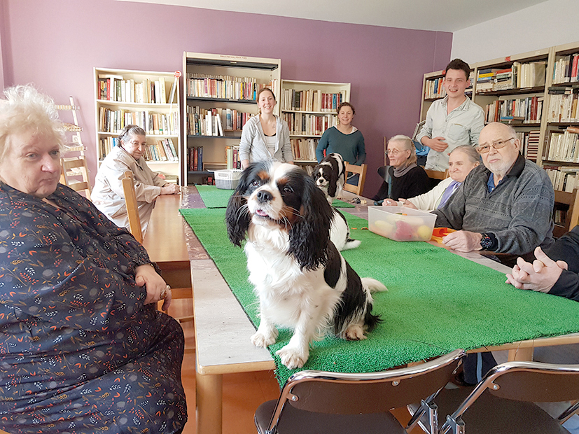 D’un coup, l’un d’eux s’écrie : « voilà les animaux ! », et des sourires illuminent les visages. Trois jeunes gens arrivent avec deux chiens en laisse, un gros lapin et une poignée de cochons d’Inde. Ces invités tant attendus organisent l’atelier « médiation animale », qui a lieu une fois par mois dans chacune des résidences. Une heure d’activités comme nourrir Michka le lapin ou confectionner des friandises pour Nénette et Nounoutte, les deux Cavalier King Charles. « C’est de la zoothérapie », explique Léo Baufumé, animateur, « le but est de passer un bon moment, créer du lien grâce aux animaux et, par cela, travailler des aptitudes comme la mémoire ou la psychomotricité ».