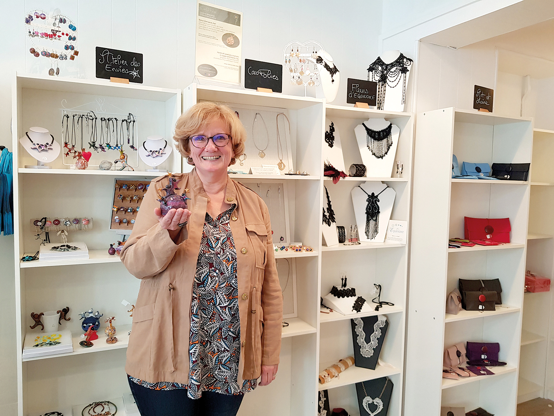 Encore un nouveau commerce rue Carnot ! Le n°21 abrite désormais une élégante boutique aux murs blancs et au sol en parquet. Sur les étagères, différents objets s’alignent : soieries, faïences, bijoux… Tous ont un point commun : être fabriqués à la main par des artisans de la région. Car en ouvrant Couleurs Créateurs, Nathalie Heulan, gérante de la boutique, « souhaite, avant tout, faire découvrir la création normande ». En effet, pour cette habitante de Mézièresen-Vexin, l’artisanat est une véritable passion. Il y a quelques années, alors qu’elle travaillait dans l’insertion professionnelle, celle-ci découvre la pâte polymère et commence à réaliser bijoux et objets dans cette matière. En 2017, elle décide de vivre de son hobby et anime des ateliers créatifs. La suite semble logique : ouvrir une boutique spécialisée. Elle sera située à Vernon et s’appellera Couleurs Créateurs.