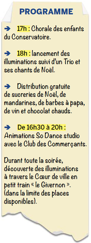 Les fêtes de fin d’année approchent, et Vernon Scintille revient. Le programme d’événements du mois de décembre sera inauguré vendredi 29 novembre à partir de 16h30 place de Gaulle. Ne manquez pas la mise en lumière de la ville et bien d’autres surprises.